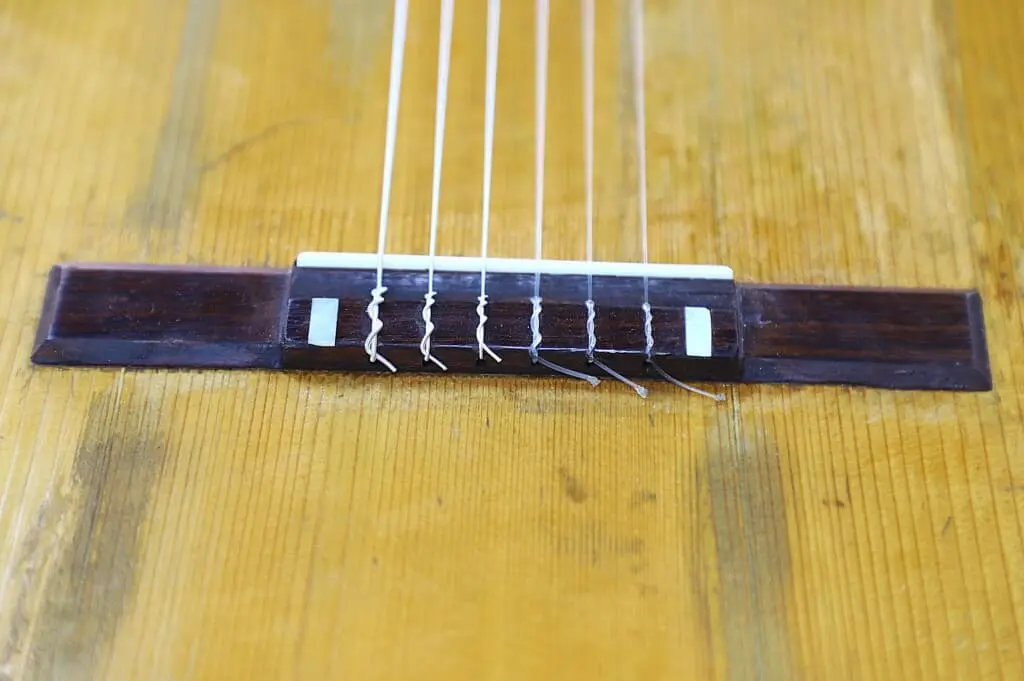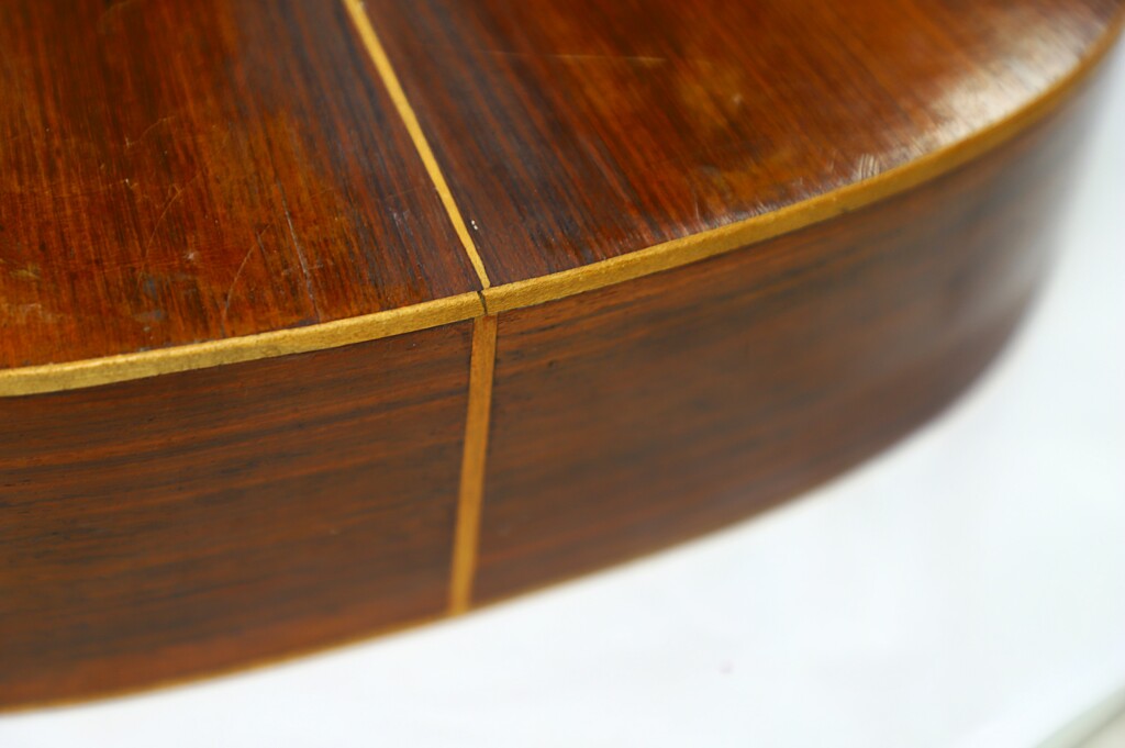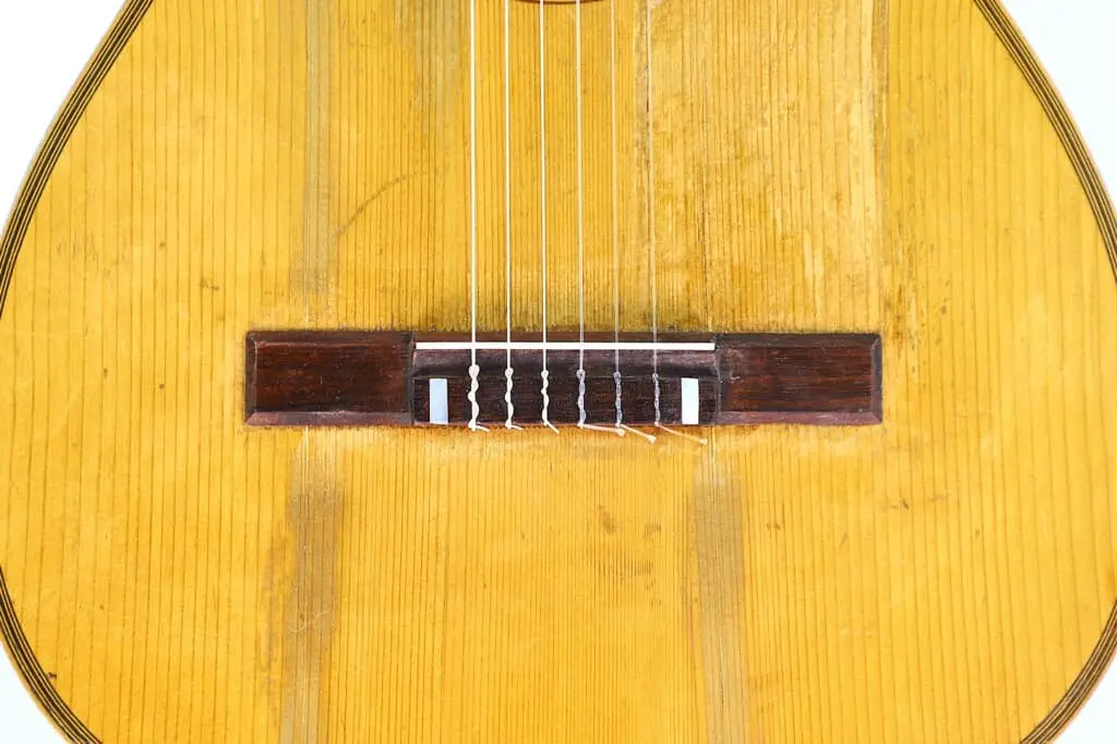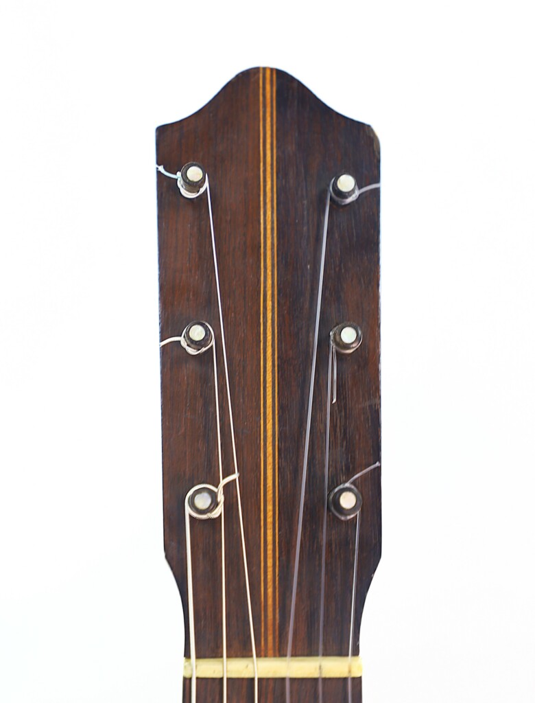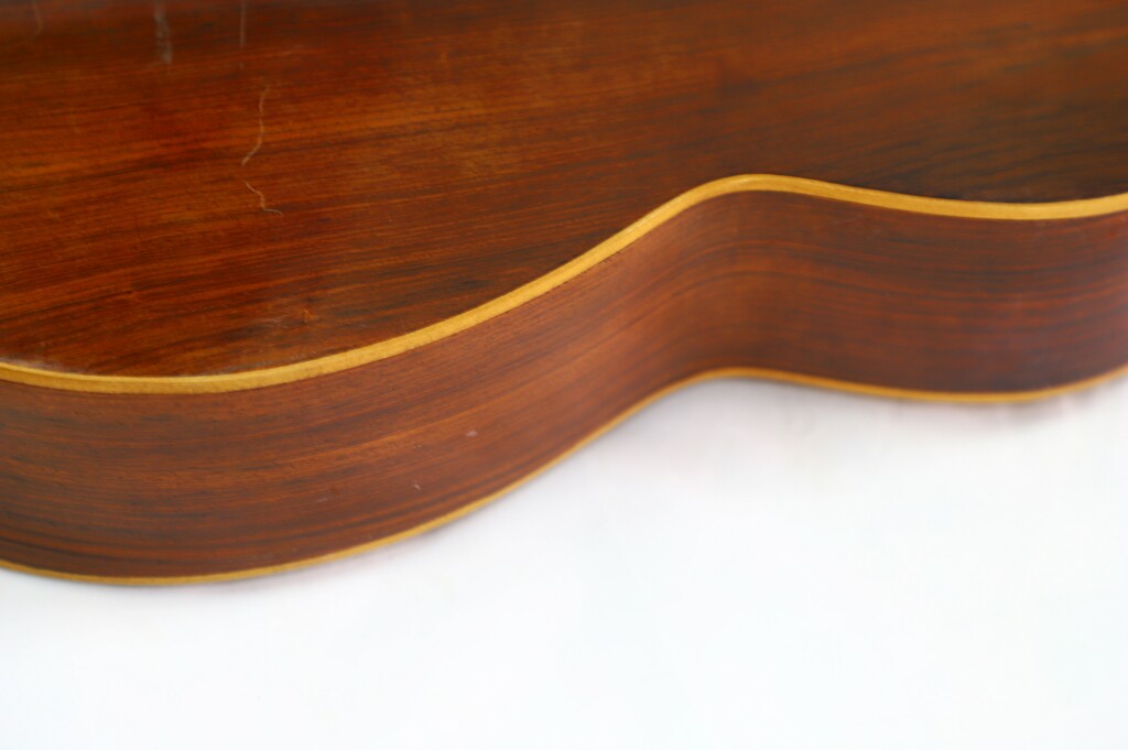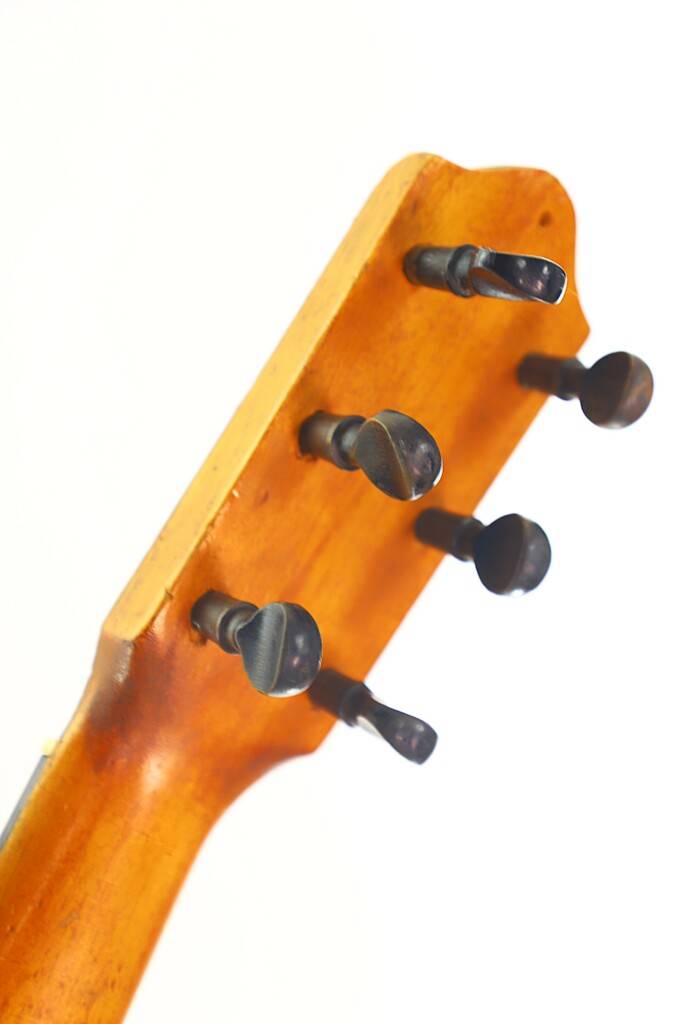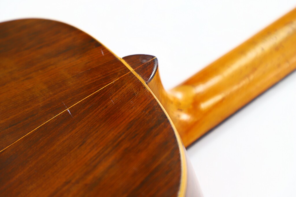 Abgesehen von einigen alten und stabilen Reparaturen ist das Instrument in einem sehr gut erhaltenen Zustand und sehr original erhalten. Die Bespielbarkeit ist mit 3,8 mm E und 3,2 mm e am 12. Bund genau richtig. Die Stegeinlage bietet sogar noch Platz für zukünftige Anpassungen.