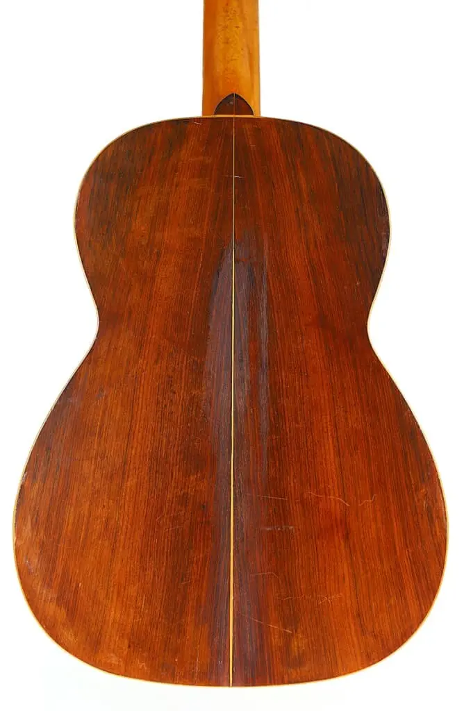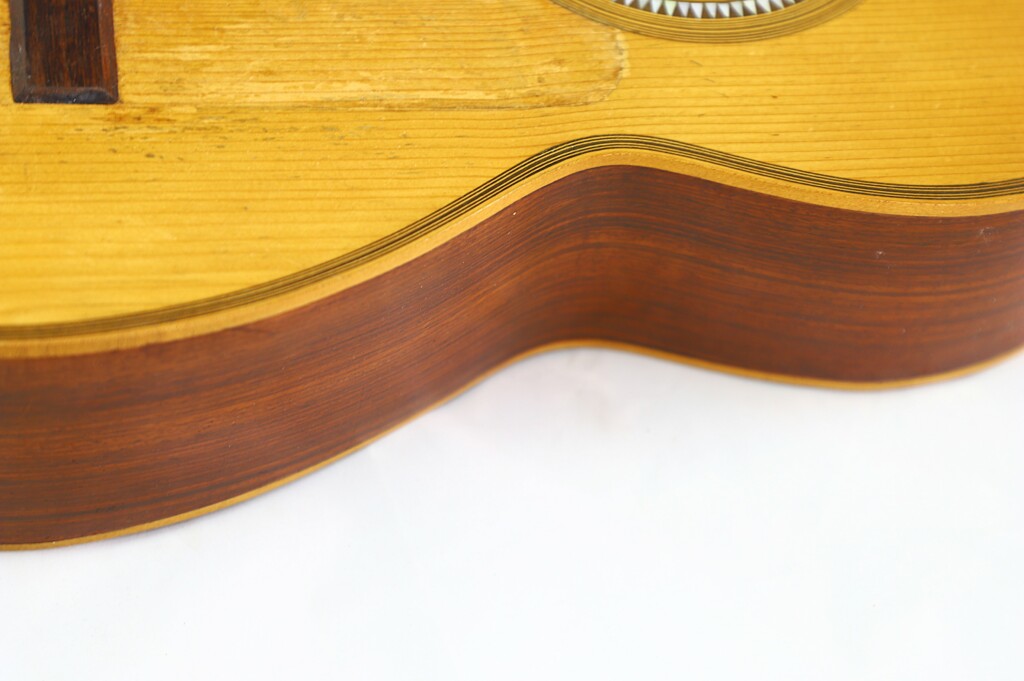 Diese besondere Gitarre ist ein wunderschönes Exemplar aus dieser Werkstatt, das mit einigen exquisiten Einlegearbeiten verziert ist. Sie hat eine Fichtendecke und Zargen und Boden aus Palisander. Die Mensur beträgt 645 mm und die Sattelbreite 50 mm. Wir lieben den großen Korpus dieser Gitarre und die feine Bauweise, die dem Klang einen sehr edlen und für Konzerte geeigneten Charakter verleiht.
