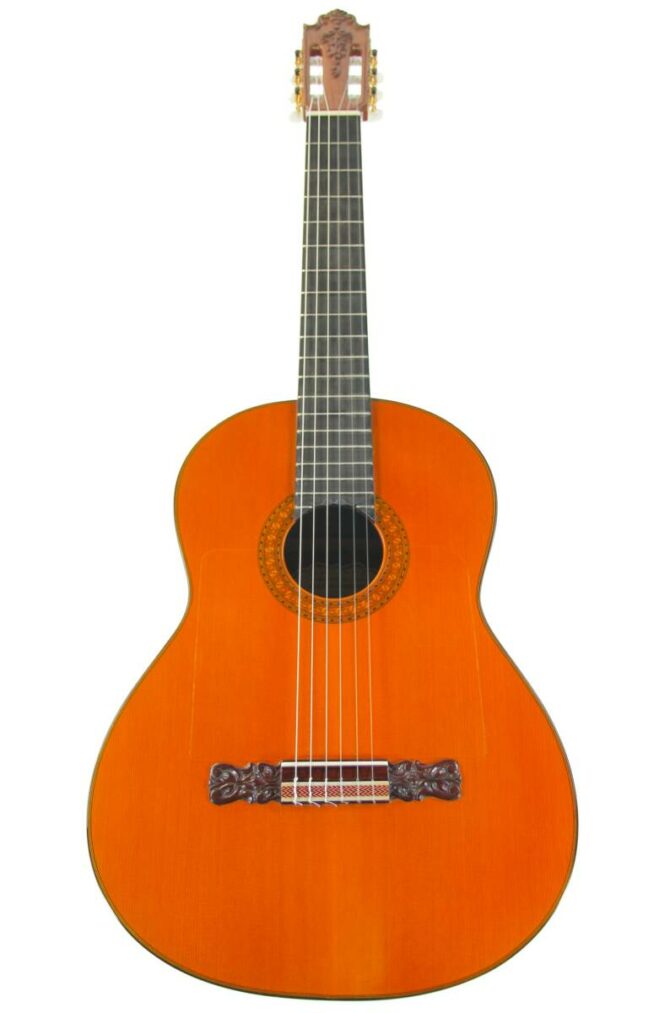 Diese Gitarre ist ein ganz besonderes Modell, das von José Ruiz Pedregosa gebaut wurde. Sie ist einfach großartig und ein Kunstwerk. Die Kopfplatte hat wunderschöne Schnitzereien, ebenso wie der Steg. Die Hölzer dieser Gitarre sind von sehr hoher Qualität. Sie hat eine Fichtendecke und Boden und Zargen aus Palisander. Der Hals hat feine Einlagen aus Ebenholz.