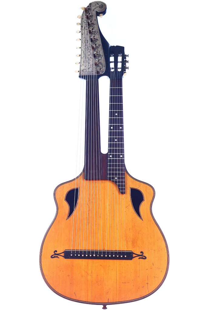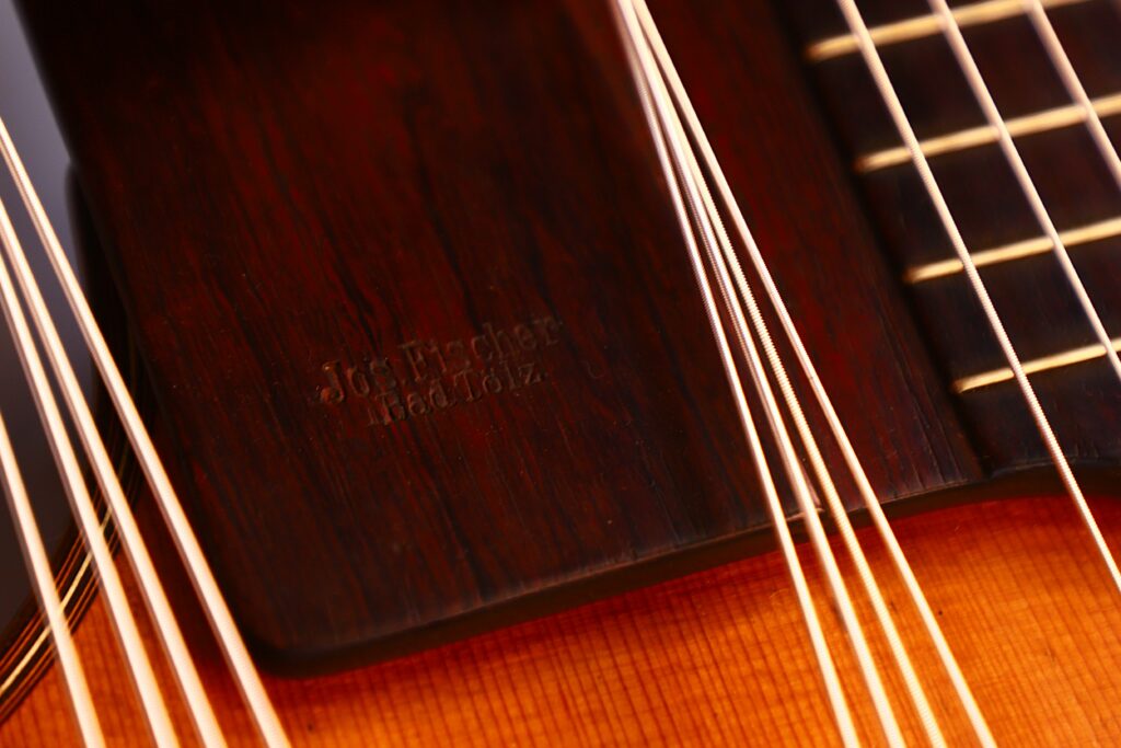 Diese außergewöhnliche Kontragitarre wurde um 1920 von Joseph Christoph Fischer gefertigt, einem renommierten Zitherspieler, Zupfinstrumentenbauer, Musikpädagogen und Komponisten aus München. Fischer war eine bedeutende Persönlichkeit der deutschen und österreichischen Musikszene und prägte mit seinen Instrumenten die Klangwelt der traditionellen Volks- und Schrammelmusik.