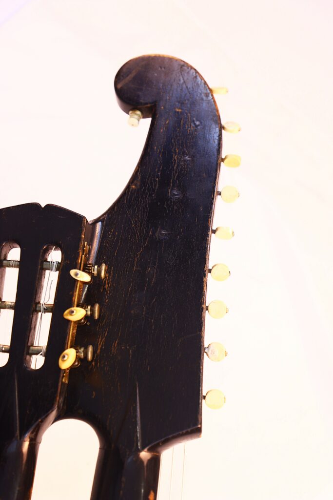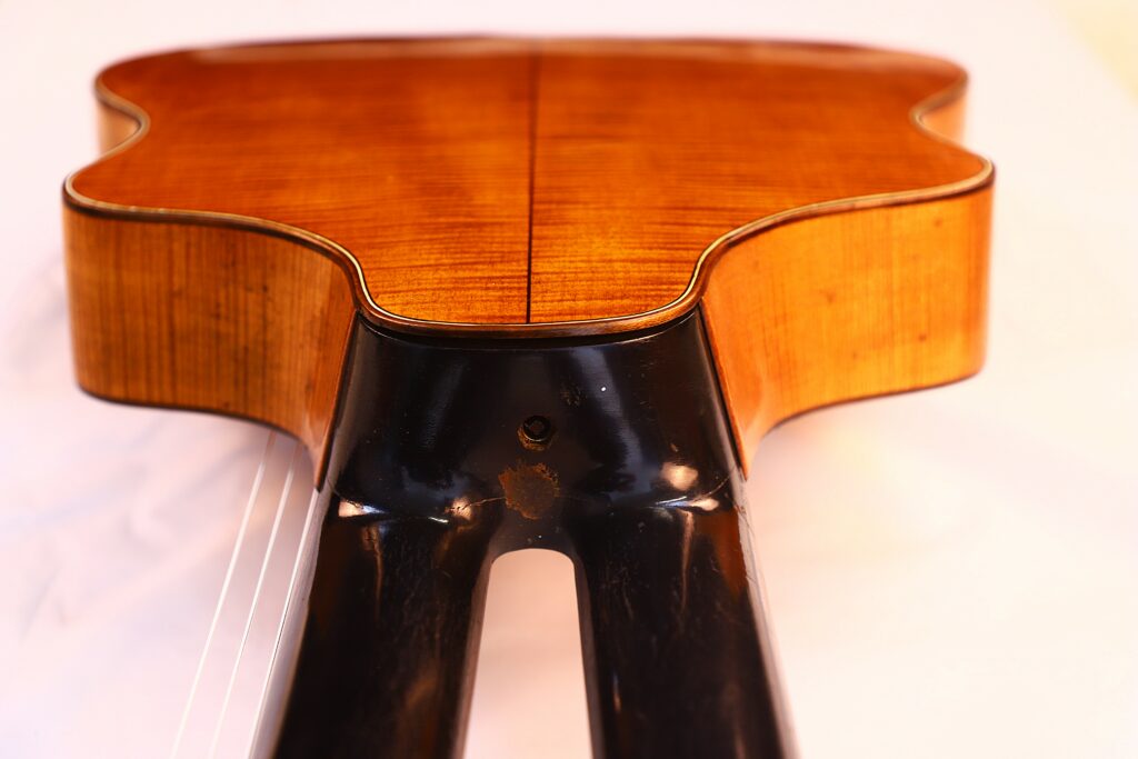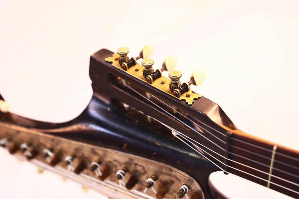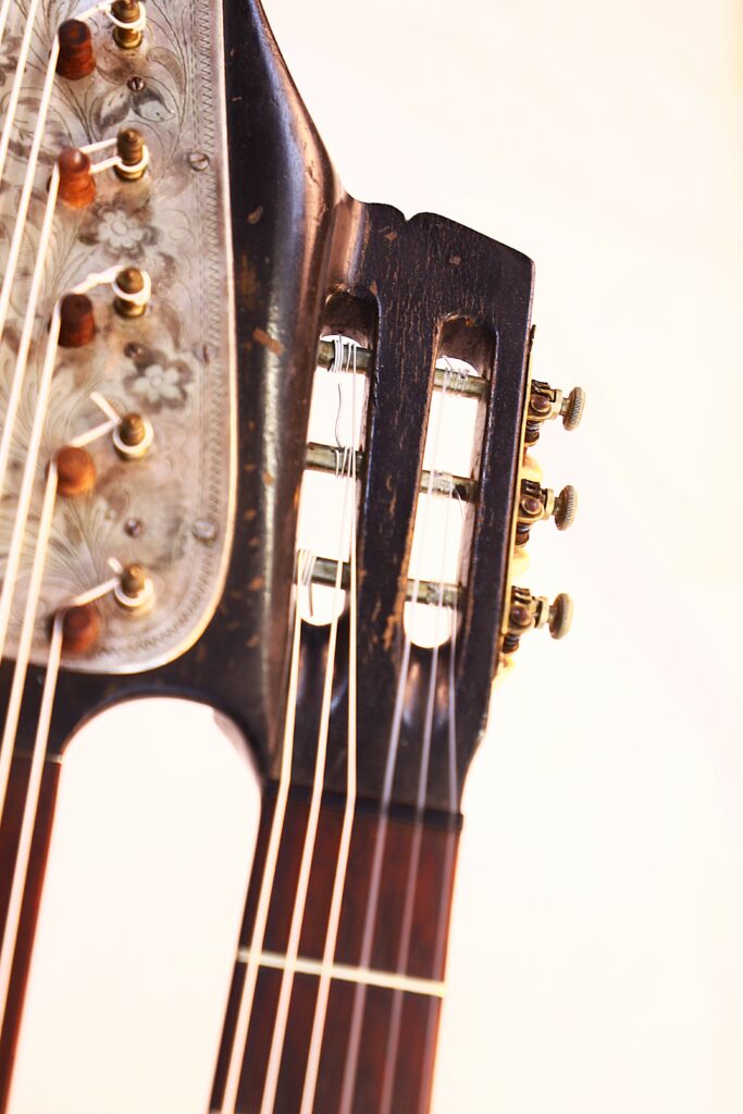 Diese Kontragitarre wurde im Stil der berühmten Wiener Gitarren gebaut und ist als Wappengitarre geformt – eine Bauweise, die insbesondere von Stauffer und seinen Schülern populär gemacht wurde. Sie besitzt die charakteristische Stauffer-Kopfplatte mit einzigartigen Mechaniken sowie einen verstellbaren Hals, eine Innovation, die eine präzise Einstellung der Saitenlage ermöglicht.