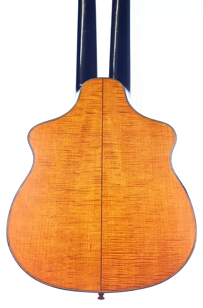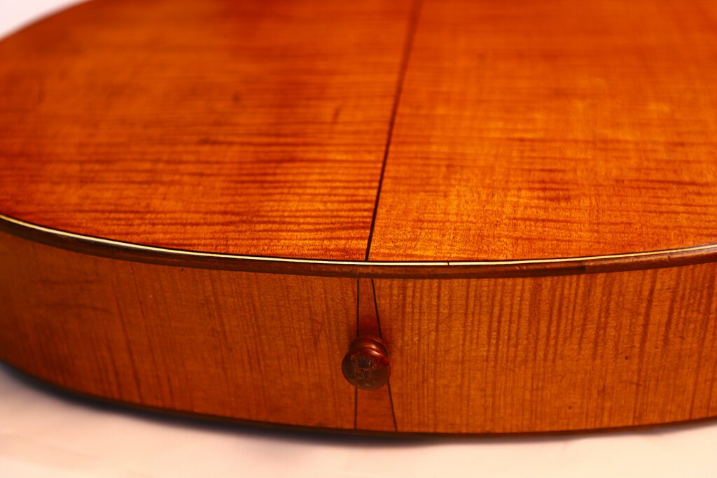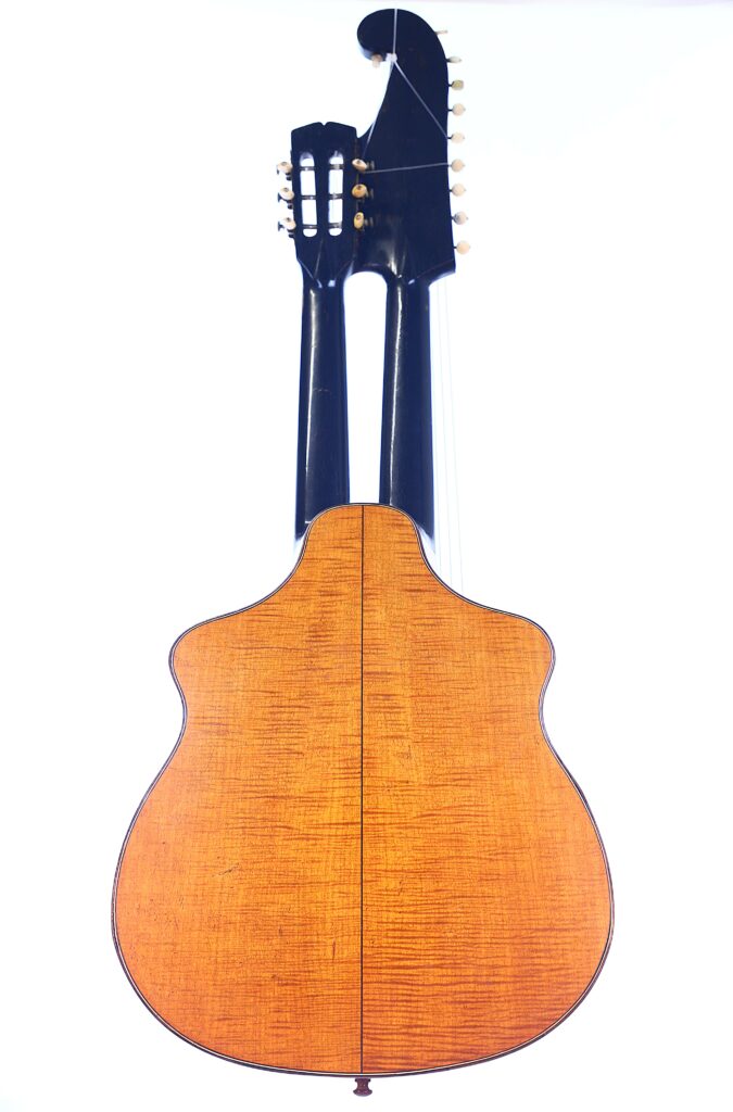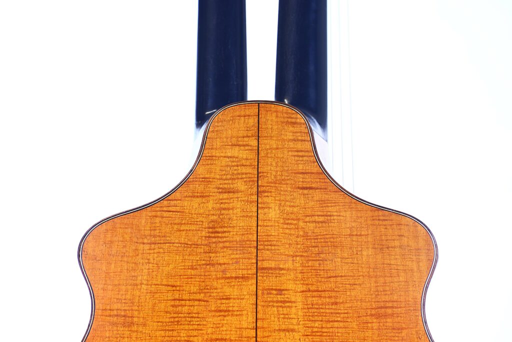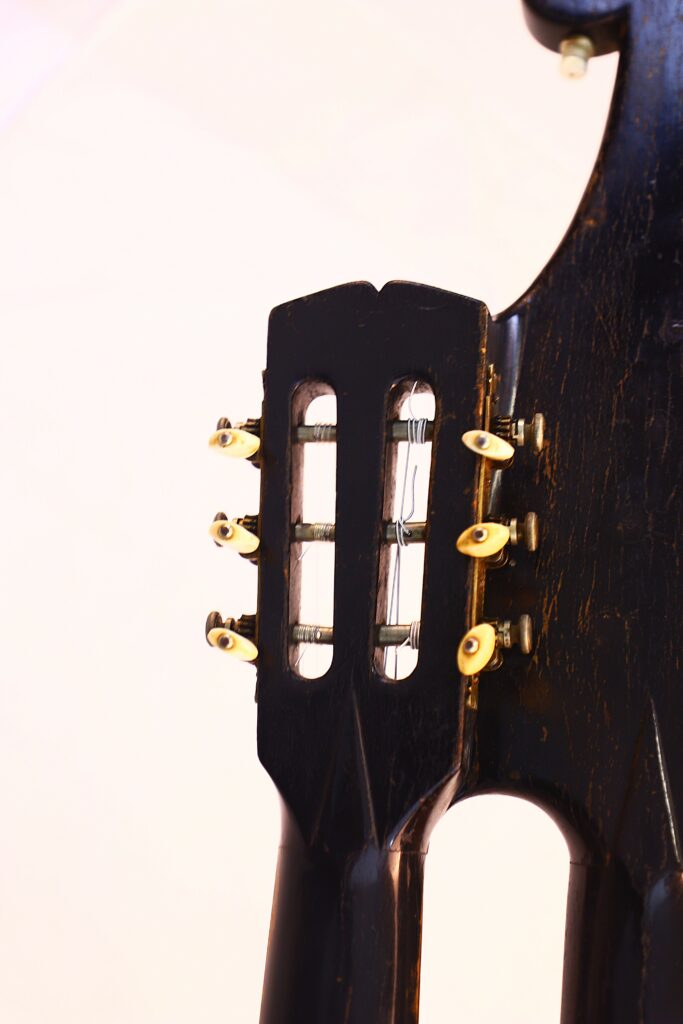Diese Kontragitarre wurde im Stil der berühmten Wiener Gitarren gebaut und ist als Wappengitarre geformt – eine Bauweise, die insbesondere von Stauffer und seinen Schülern populär gemacht wurde. Sie besitzt die charakteristische Stauffer-Kopfplatte mit einzigartigen Mechaniken sowie einen verstellbaren Hals, eine Innovation, die eine präzise Einstellung der Saitenlage ermöglicht.