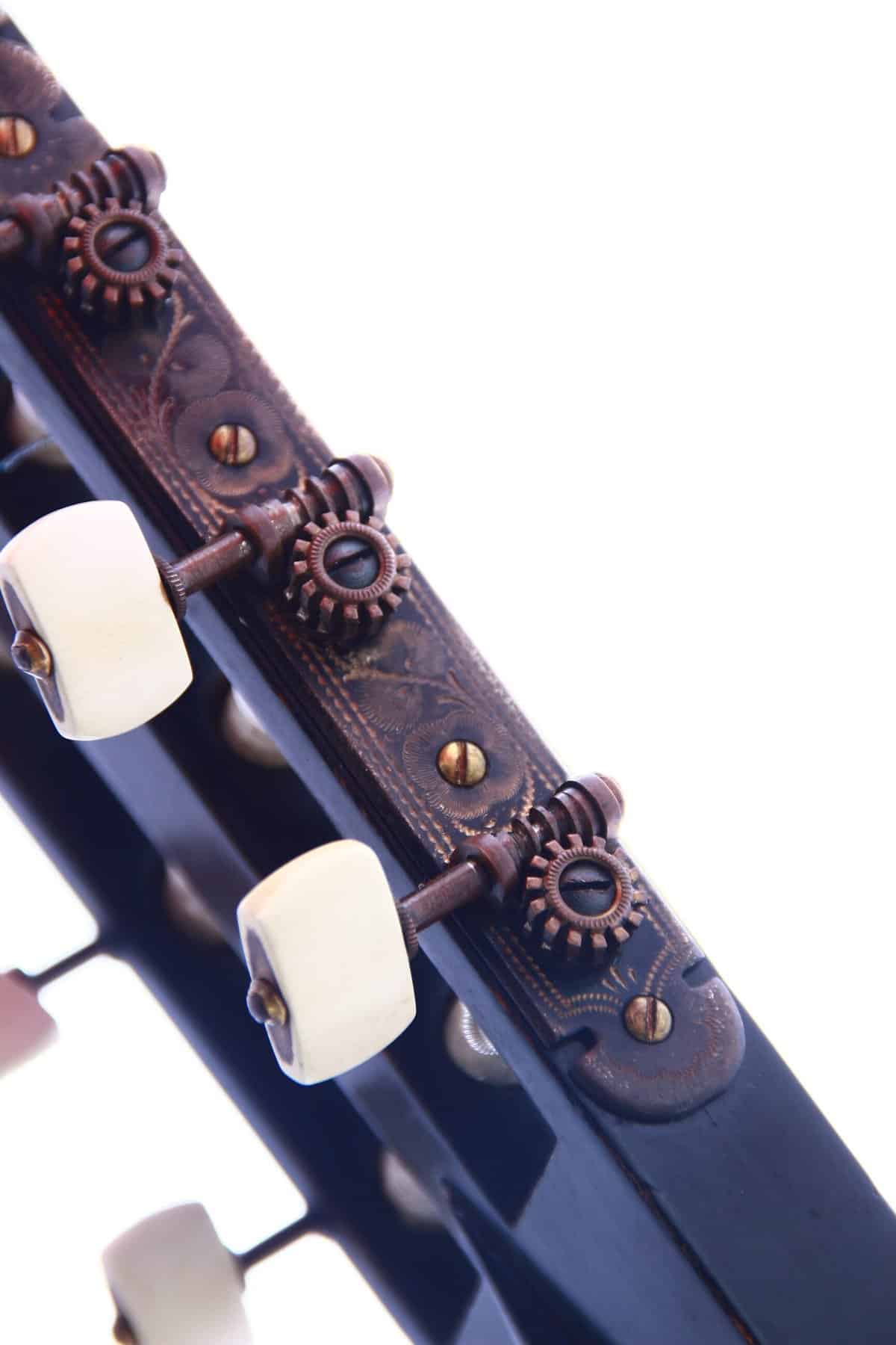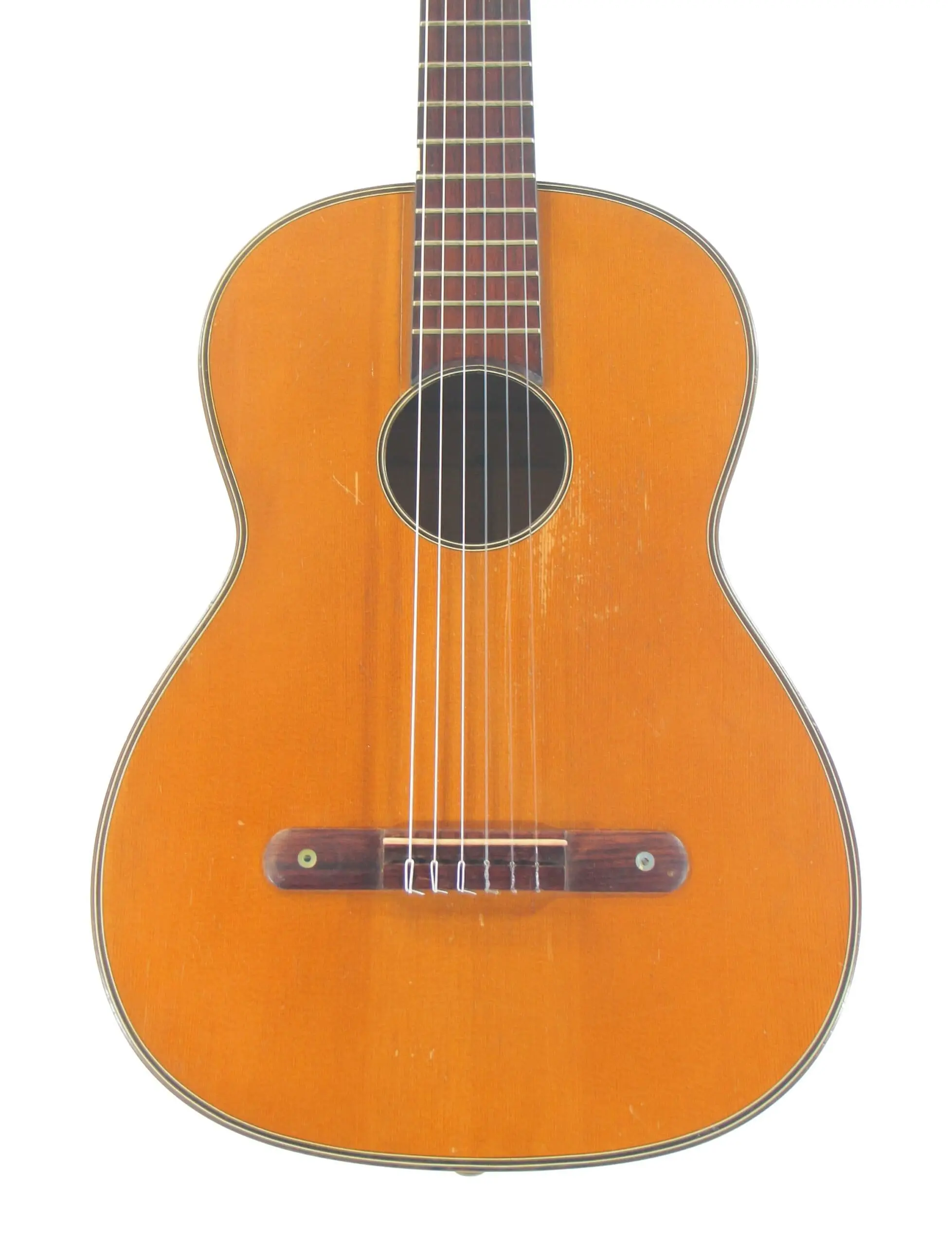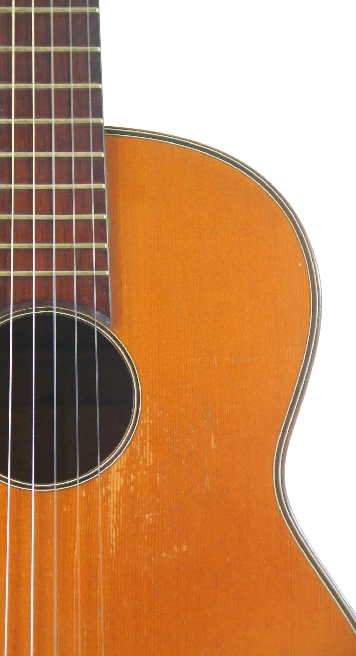 Dieses besondere Instrument ist ein Torres-Modell von 1926. Es ist eine wunderschön gebaute Gitarre mit leichter Torres Fächerbeleistung . Die Mensurlänge beträgt 655 mm und die Sattelbreite 50 mm. Die Decke ist aus Fichte. Boden und Zargen aus Ahorn.