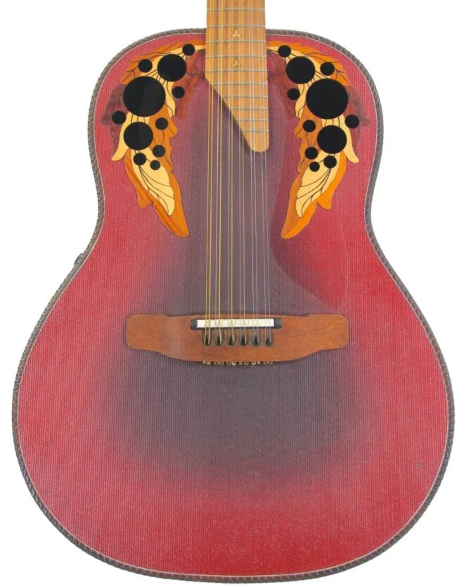 Dies ist ein seltenes Adamas II 12-saitiges „1685-2“ Modell in roter Farbe mit tiefem Korpus., Die Carbon-Graphit-Decke und der tiefe Rundkorpus aus dem für Ovation berühmten Kunstharz, geben dieser tollen Gitarre eine besondere Tiefe im Klang und das entsprechende Durchsetzungsvermögen – die Gitarre ist sehr laut! Die Gitarre hat auch eine gute und direkte Ansprache, die nur mit die nur mit dieser Adamas Bauweise erreicht werden kann. Das OP24-Preamp-System verleiht dieser 12-saitigen Gitarre einen guten und dichten verstärkten Klang, was einer der Gründe ist, warum diese Gitarren auch heute noch so beliebt sind.