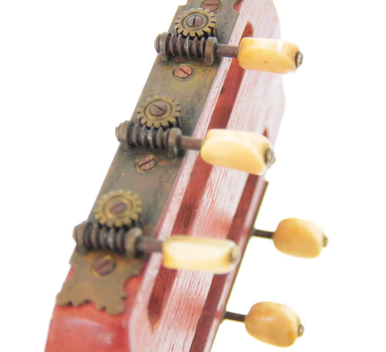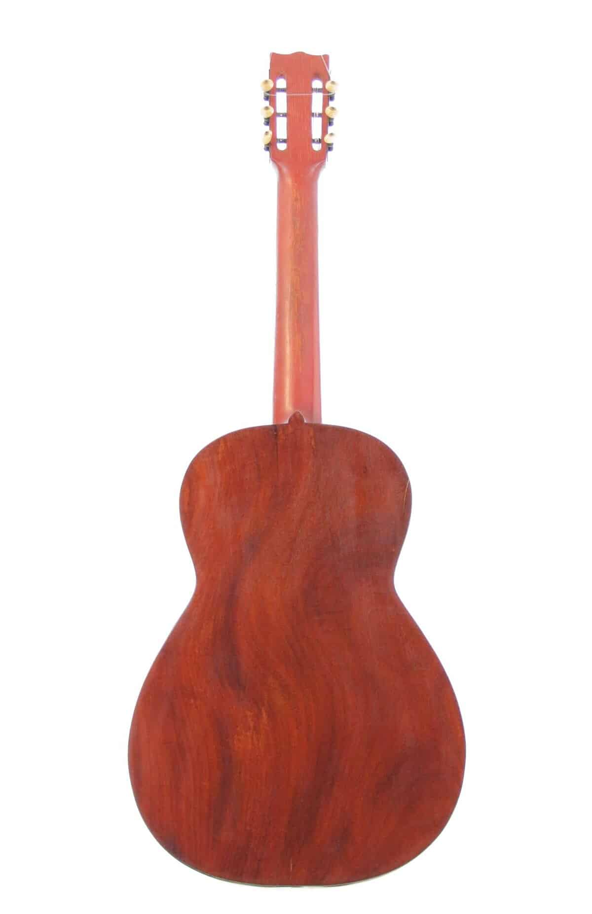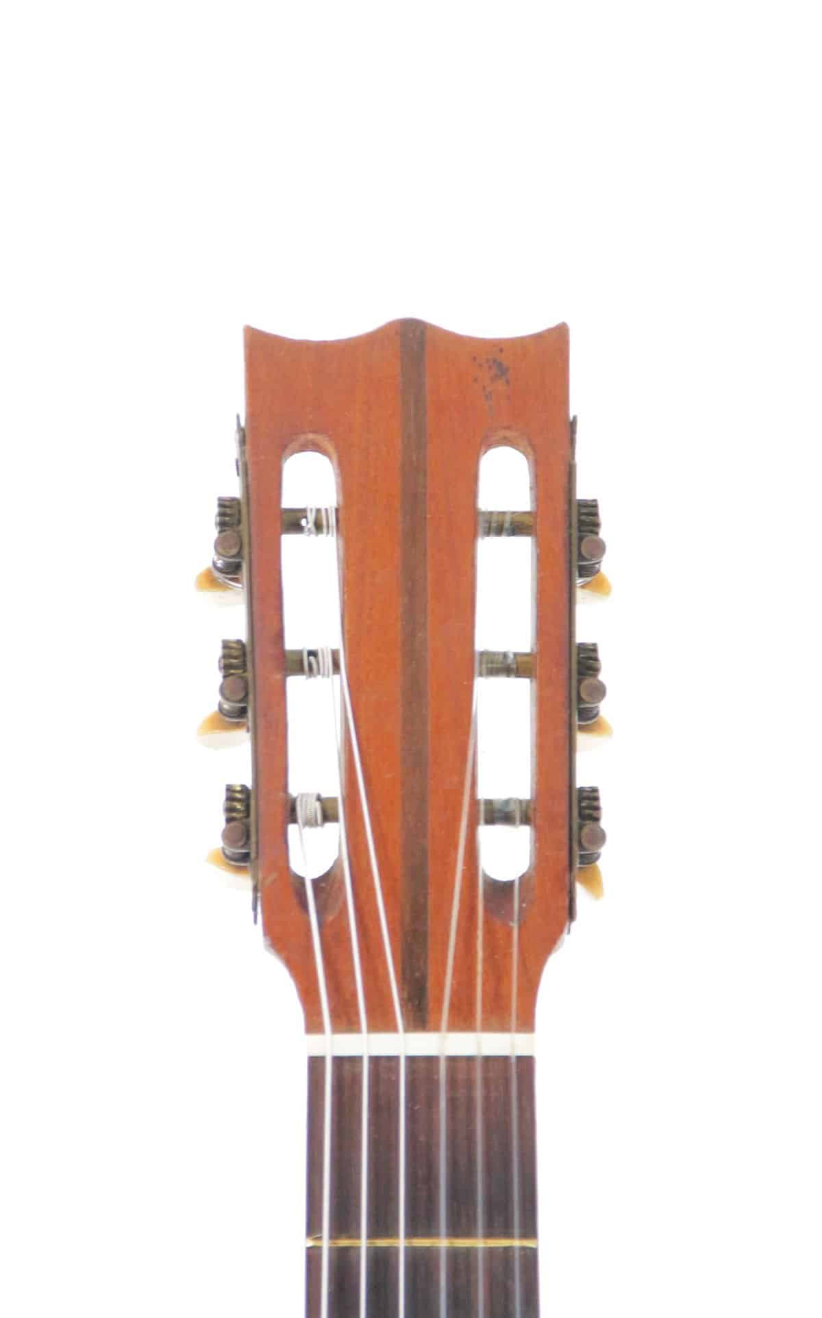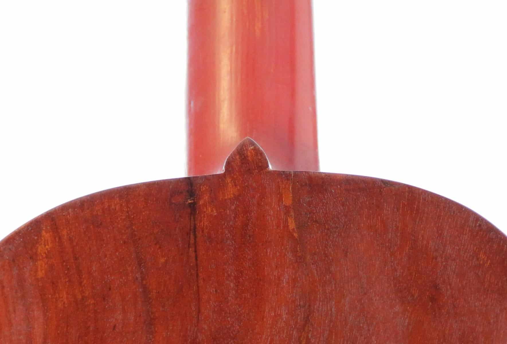 This guitar is a model with a smaller body. It can probably be dated to the time around 1890. The top is of fine spruce and the back and sides of pearwood. The scale length is 648 mm and the nut width 49 mm.
