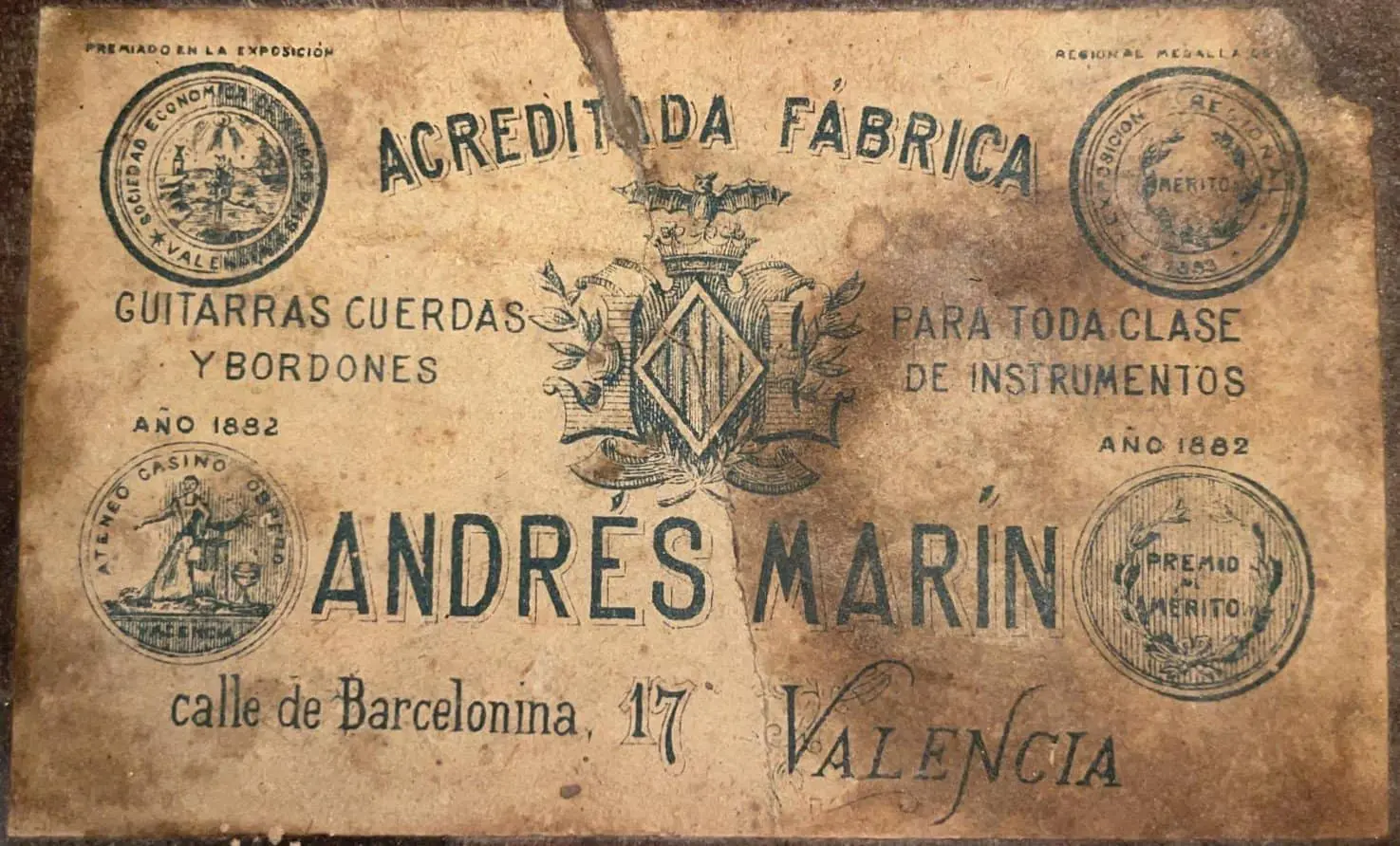 Andrés Marin (active from 1880-1950) was one of the most renowned guitar makers in Valencia. He married the widow of Agustin Almonacid, who had a guitar factory on Calle Barcelona 17 and whose successor he became around 1882. The factory produced guitars, bandurrias, lutes, mandolins and a variety of other instruments.