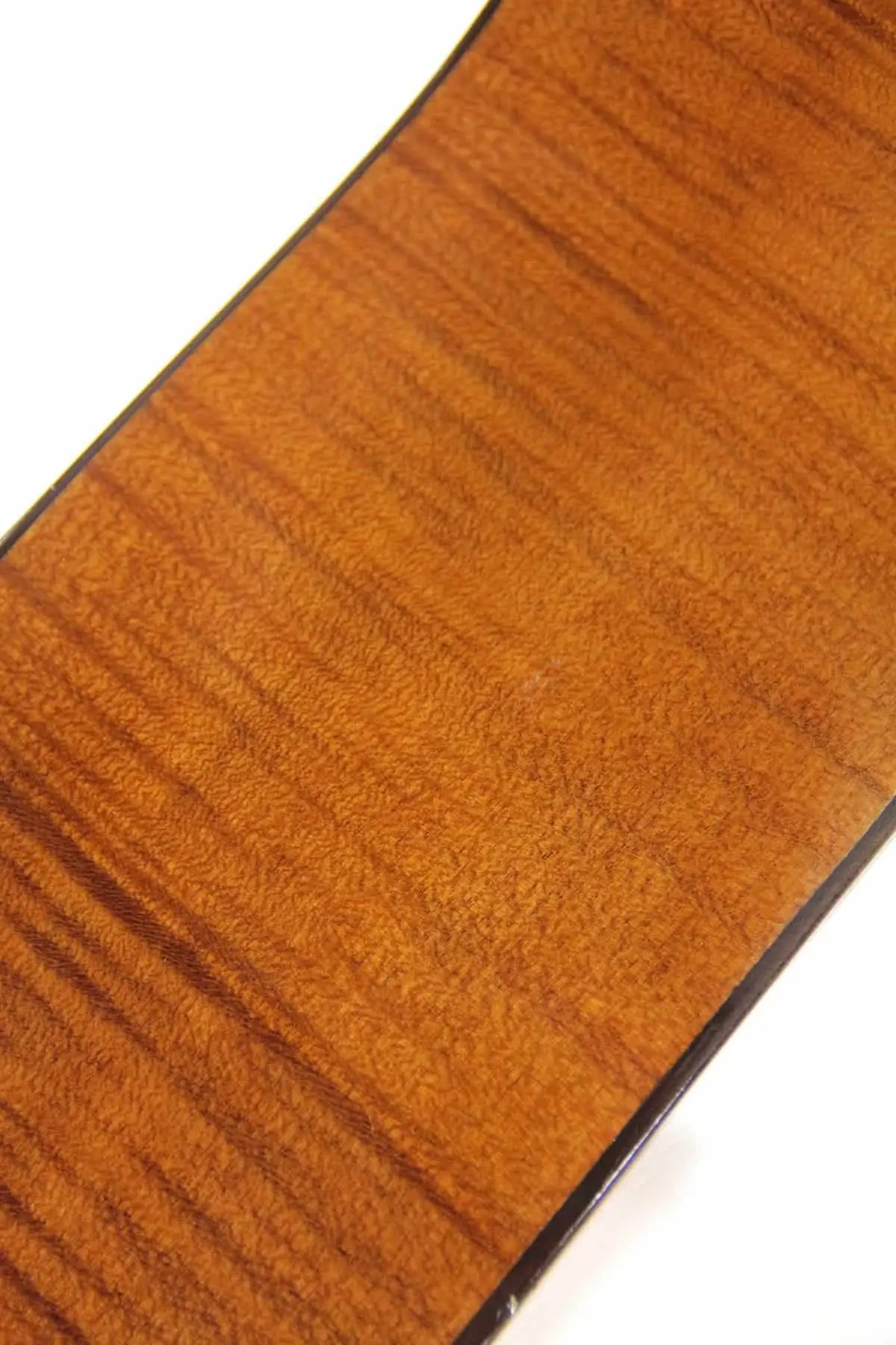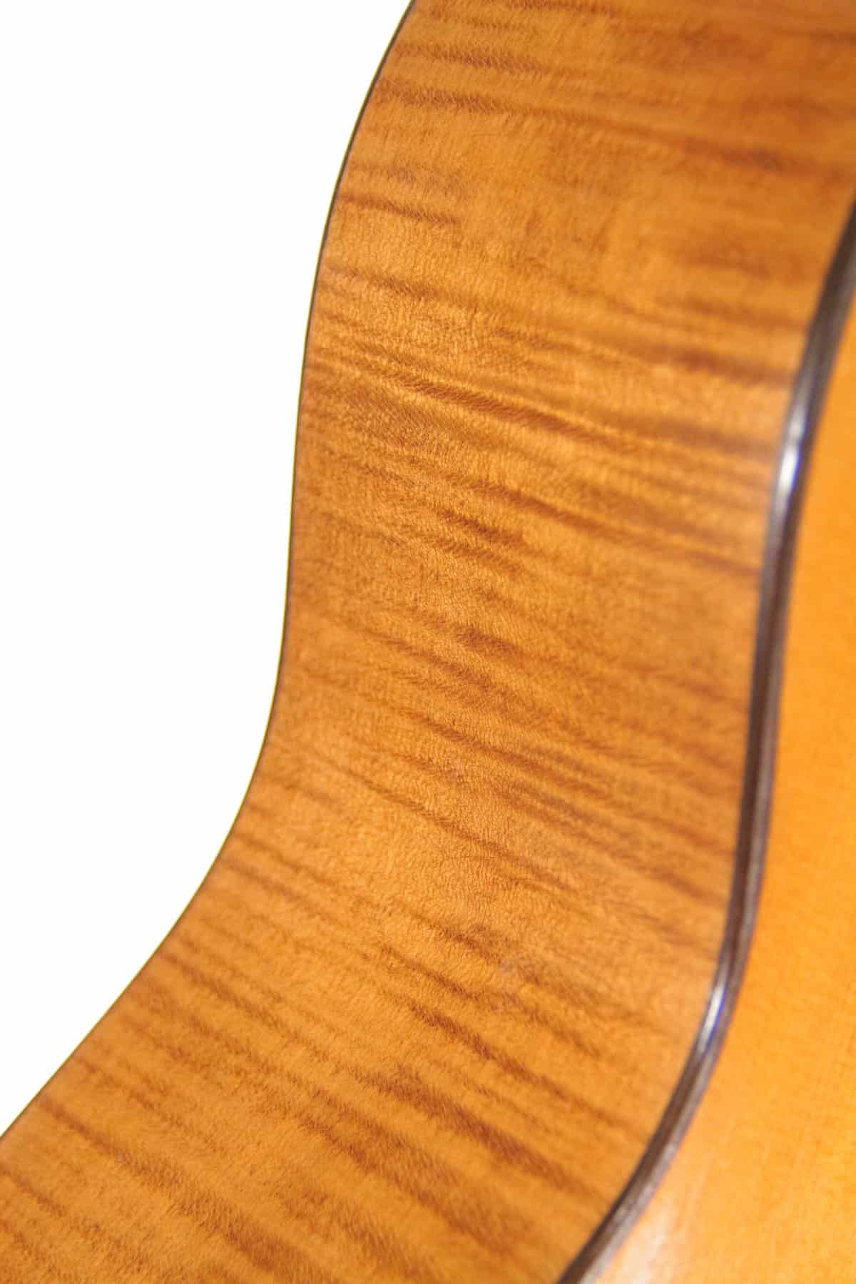Der Korpus ist aus Ahorn, die Decke ist aus Fichte. Sie hat eine kürzere Mensur von 640 mm und eine Sattelbreite von 53 mm.