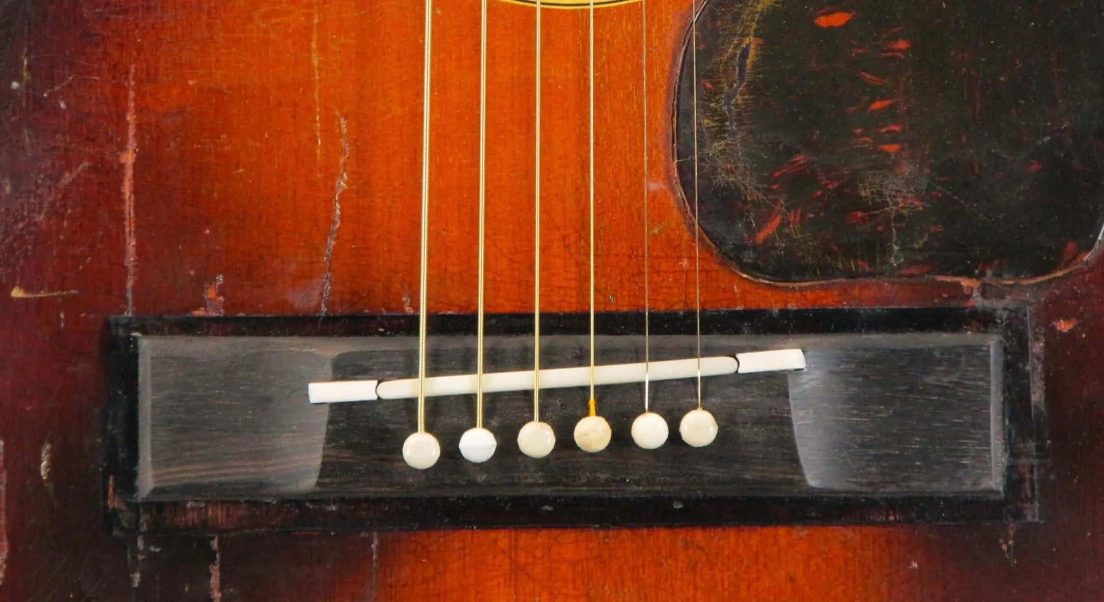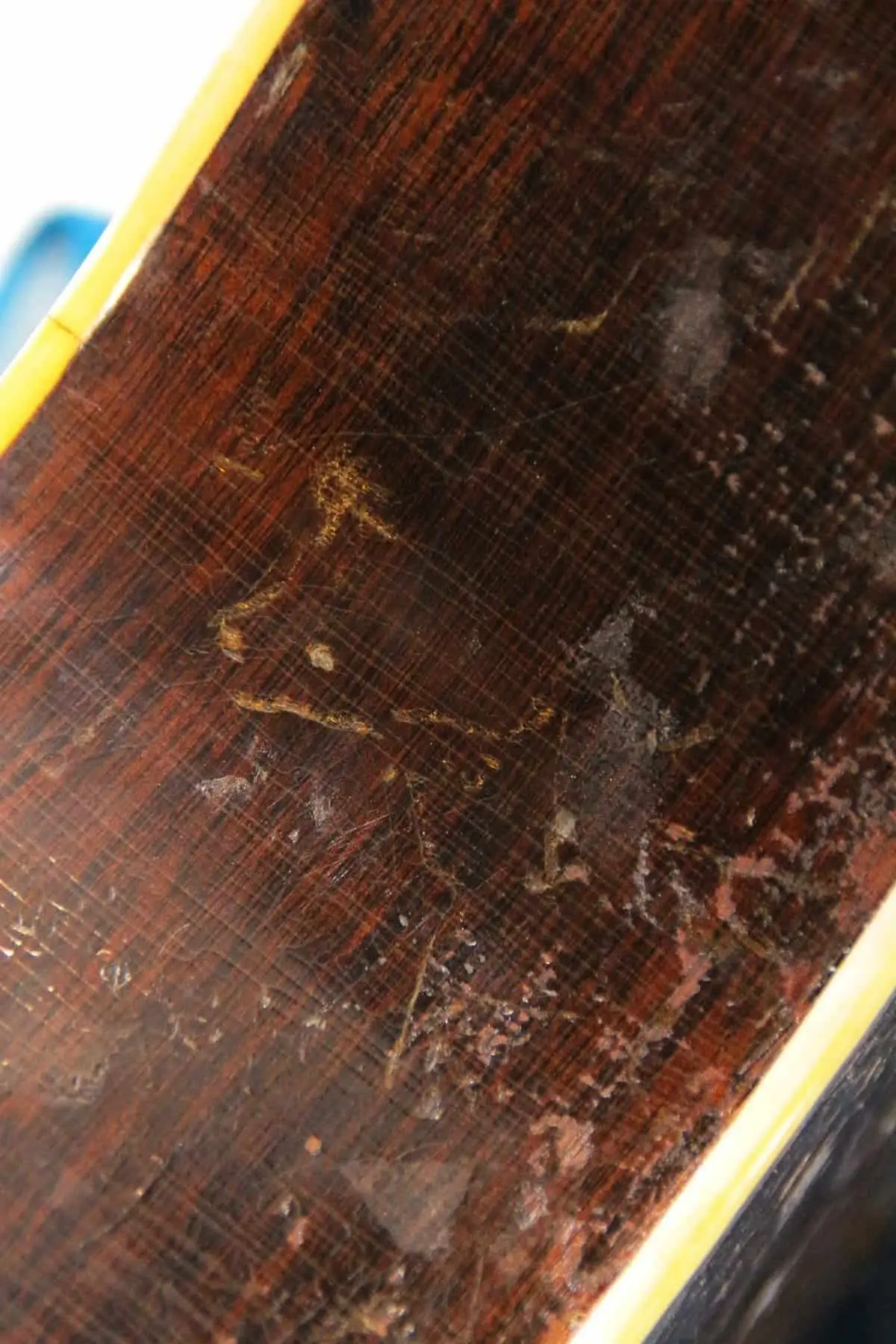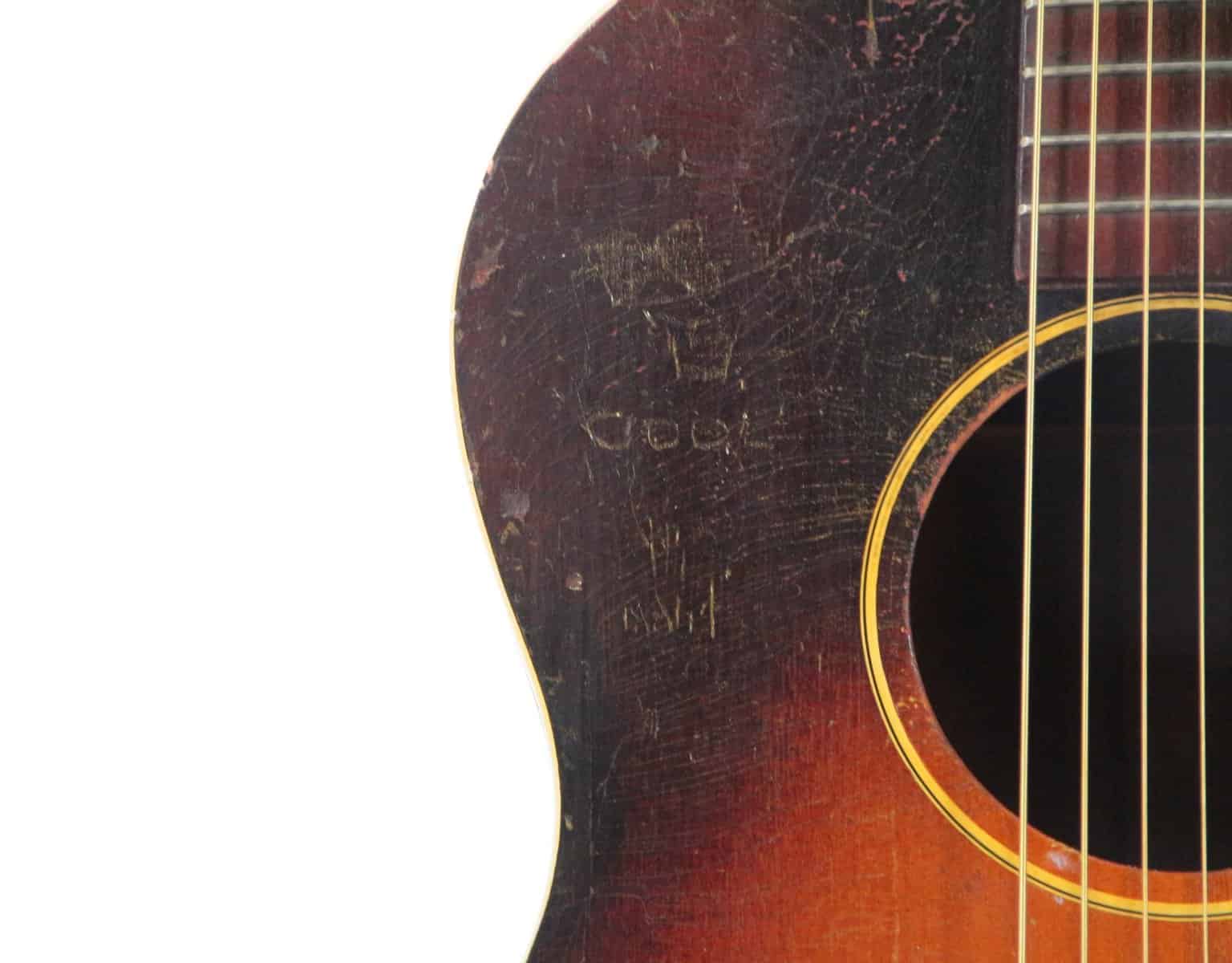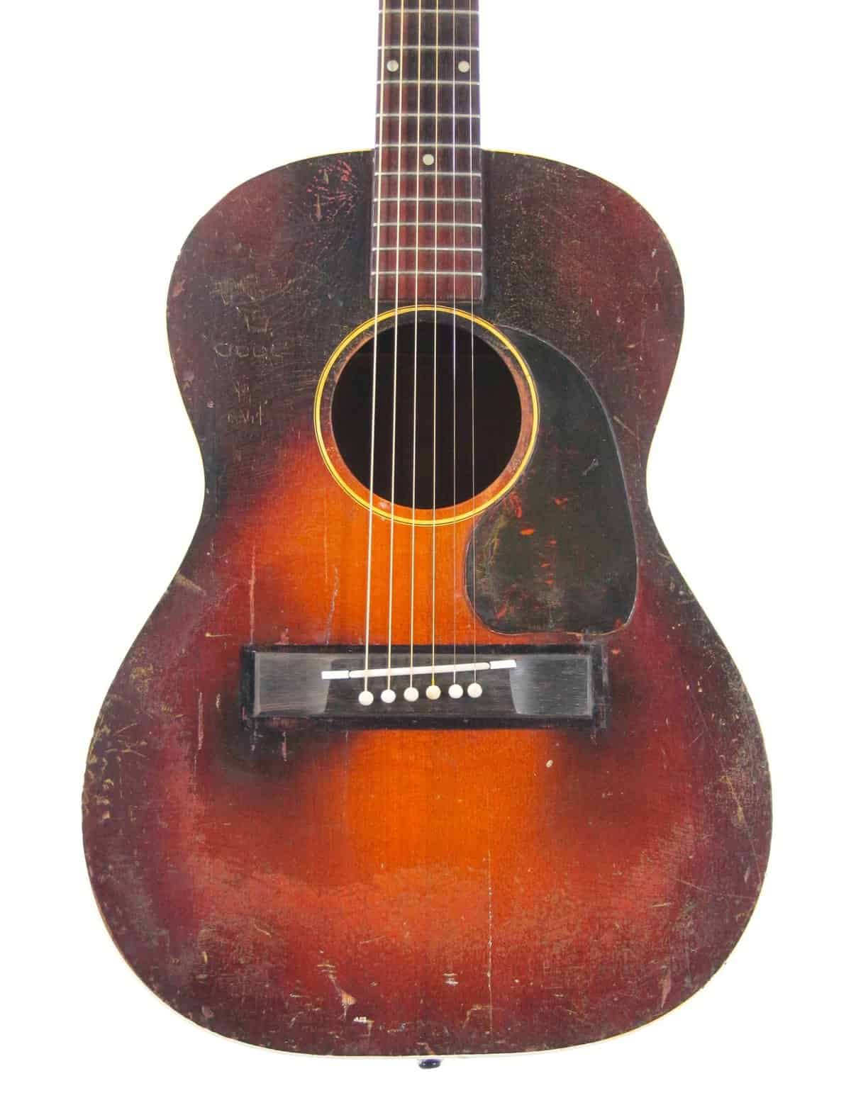 This guitar is in player grade condition. It has been professionally restored and the bridge has been replaced (including some work around the bridge area). The finish is original, but has a huge amount of wear from play and use all around. Some cracks have also been repaired.