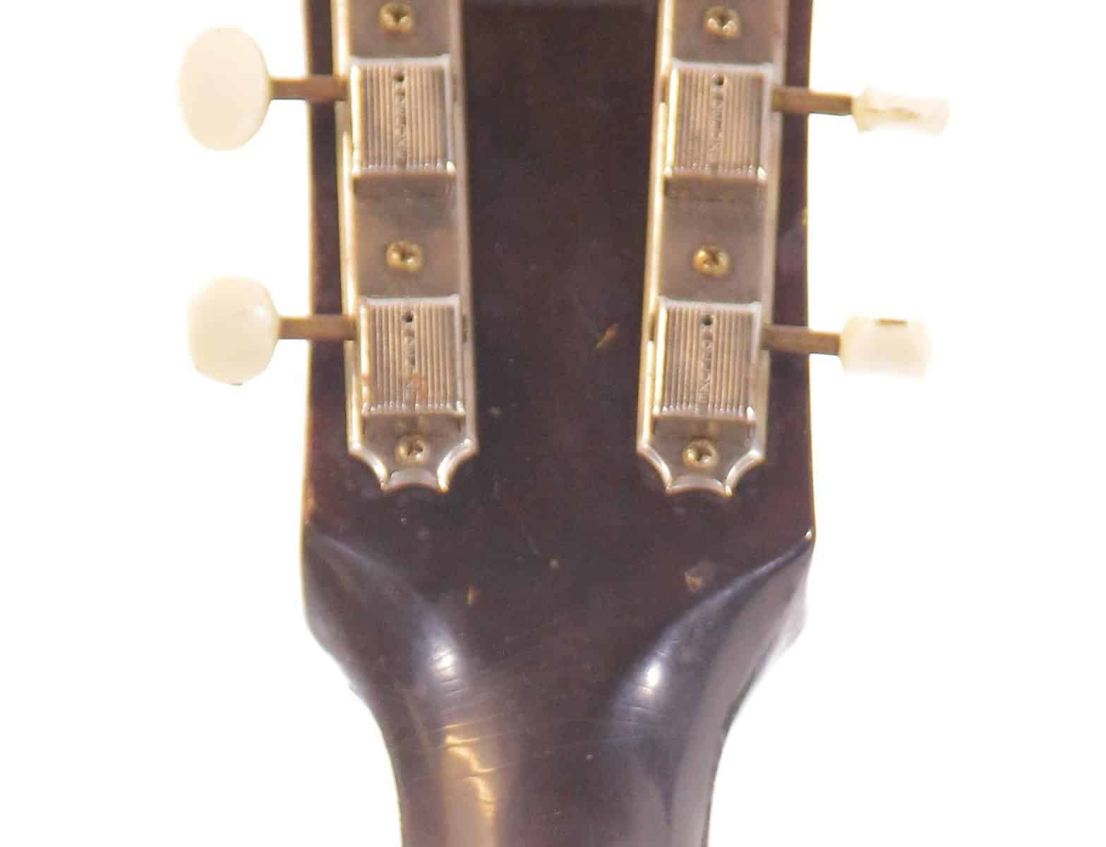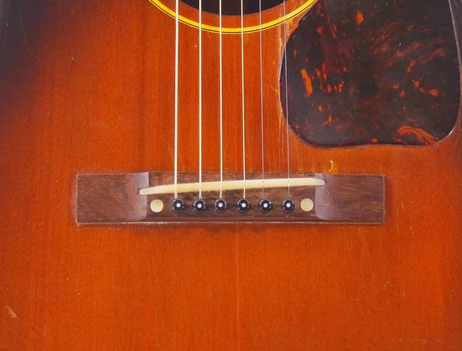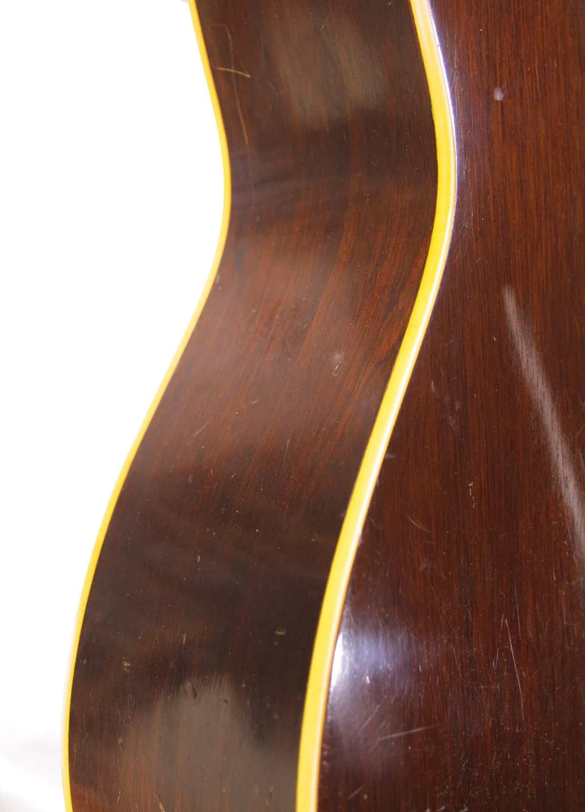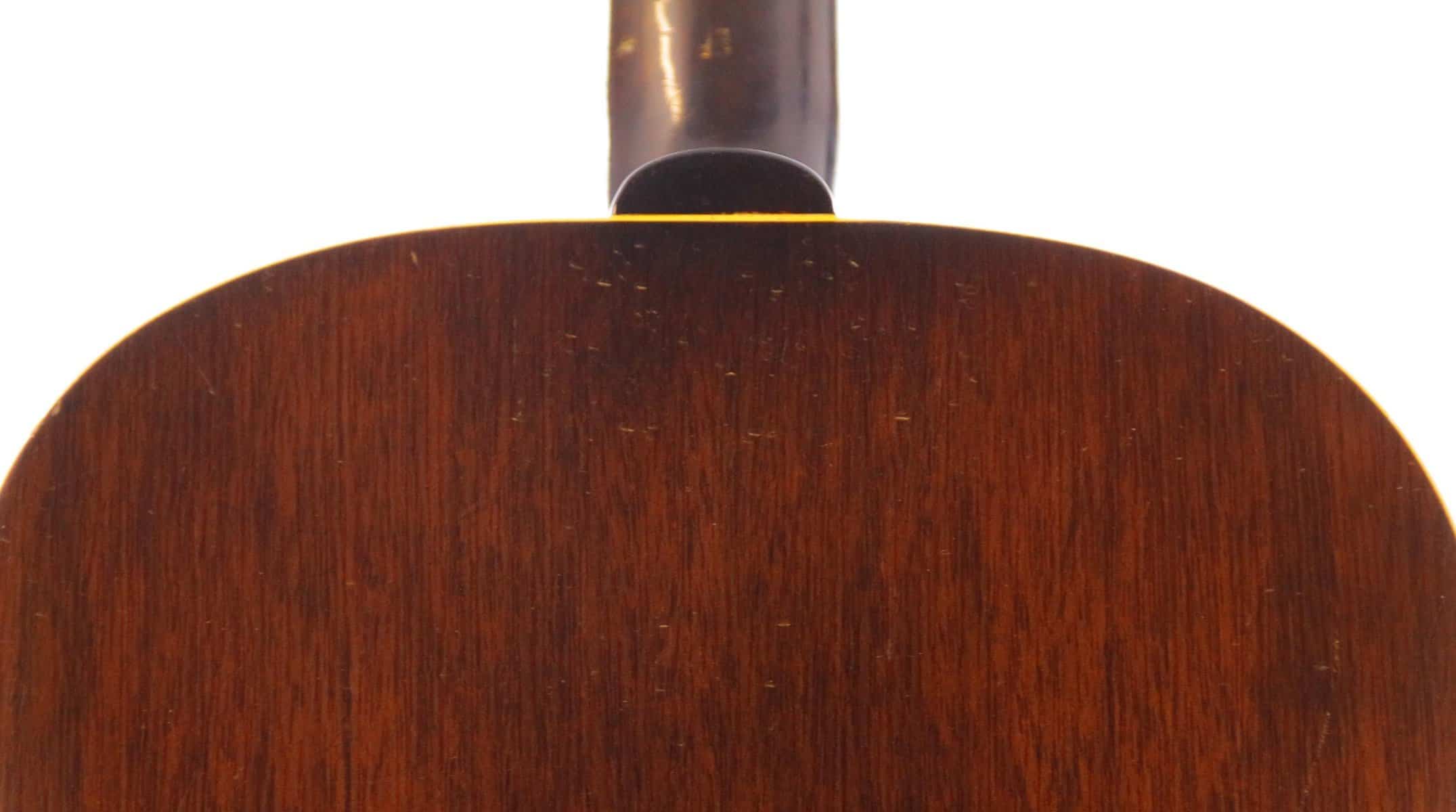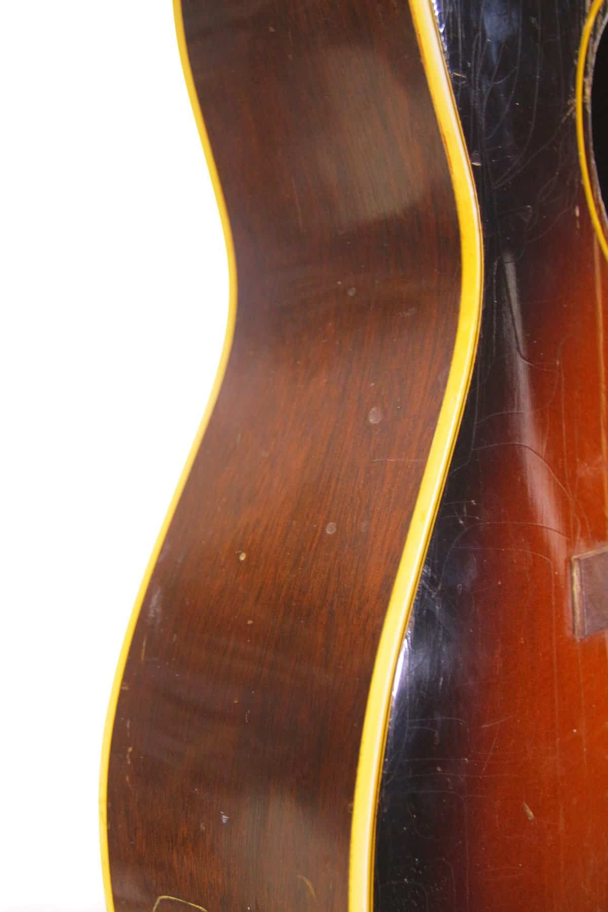 Diese schöne Gitarre ist aus massivem Fichtenholz und Mahagoni gebaut, mit einem schön gealterten warmen Sunburst-Finish, einem Mahagoni-Hals mit Palisander-Griffbrett und einem Palisander-Steg. Sie hat die originalen Mechaniken.