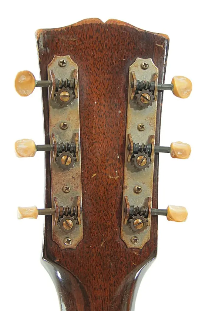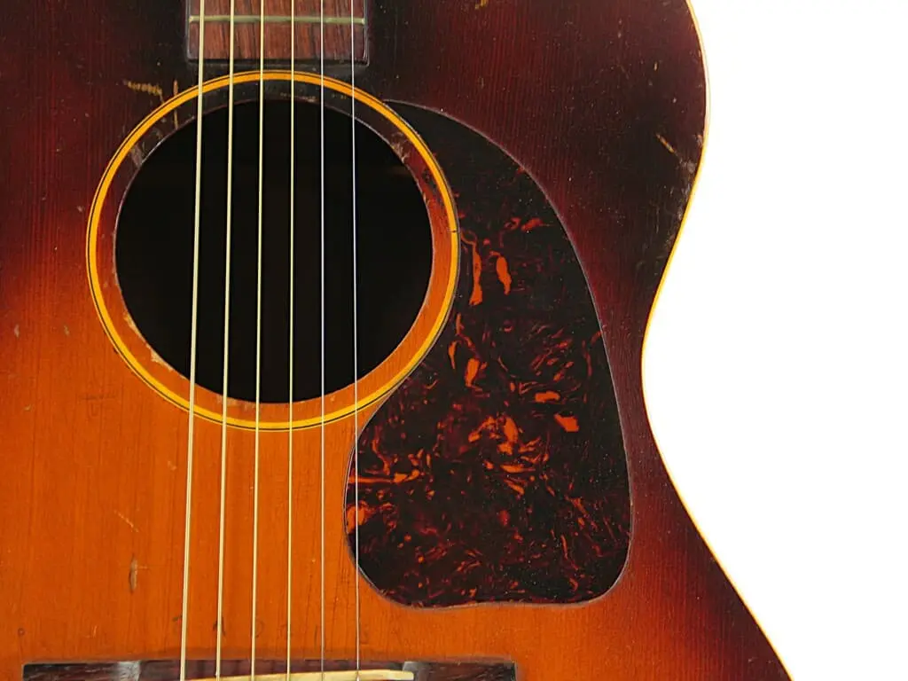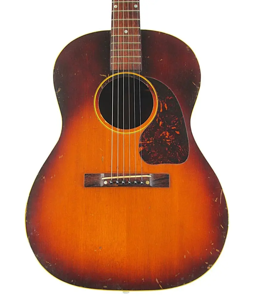 Diese schöne Gitarre ist aus massivem Fichtenholz und Mahagoni gebaut, mit einem schön gealterten warmen Sunburst-Finish, einem Mahagoni-Hals mit Palisander-Griffbrett und einem Palisander-Steg. Sie hat die originalen Vintage-Mechaniken.