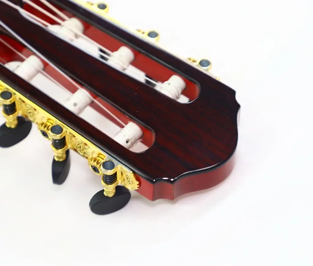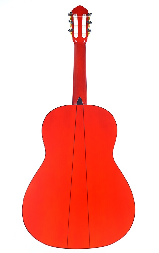 Die Decke ist aus bestem Fichtenholz und der Boden und die Zargen aus feinster Zypresse gefertigt. Die Sattelbreite beträgt 52 mm und die Mensur 650 mm.