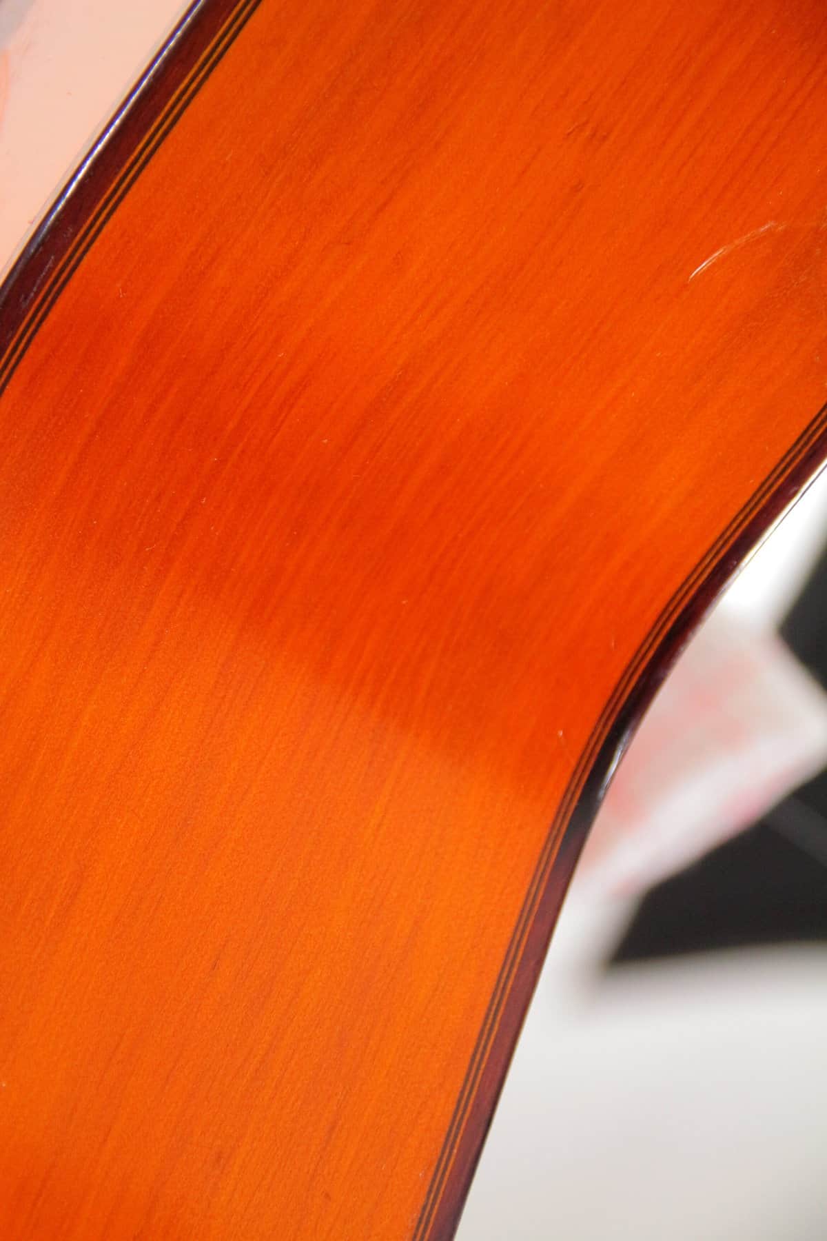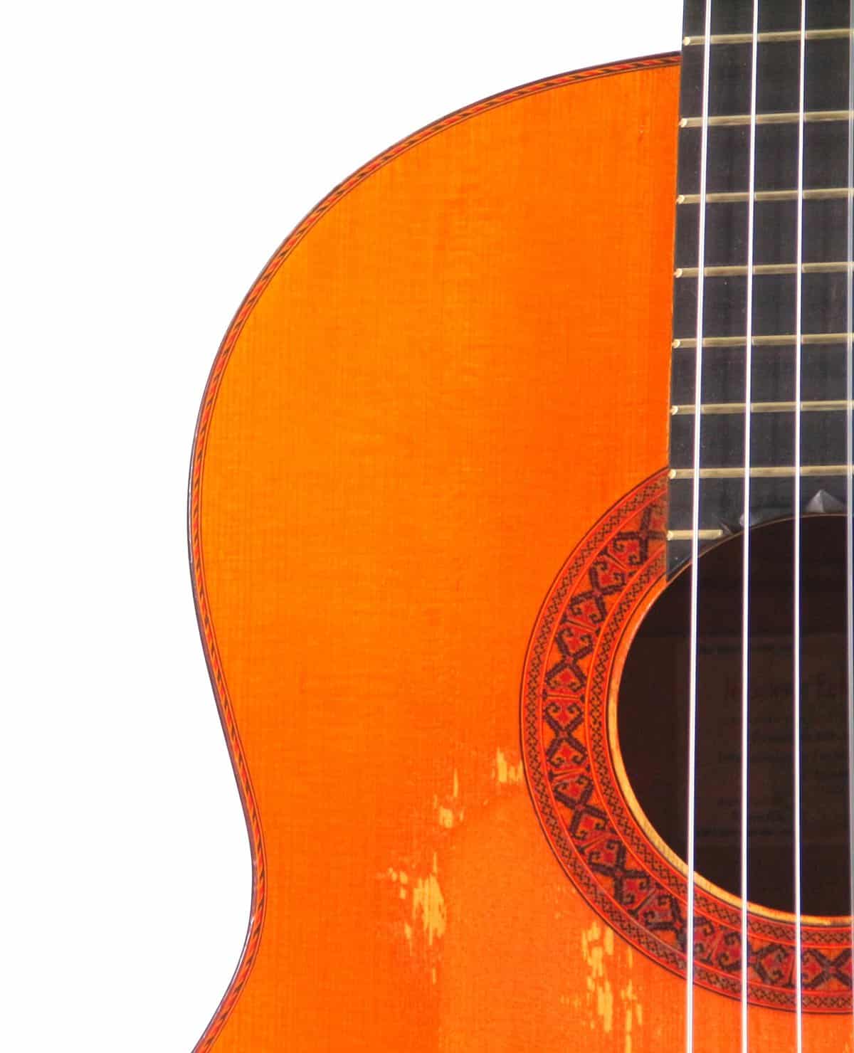 Sie spielt sich leicht und hat eine niedrige Saitenlage. Die Mensurlänge beträgt 670 mm und die Sattelbreite 52 mm. Die Decke ist aus sehr feinem Fichtenholz, Boden und Zargen aus schönem Zypressenholz.