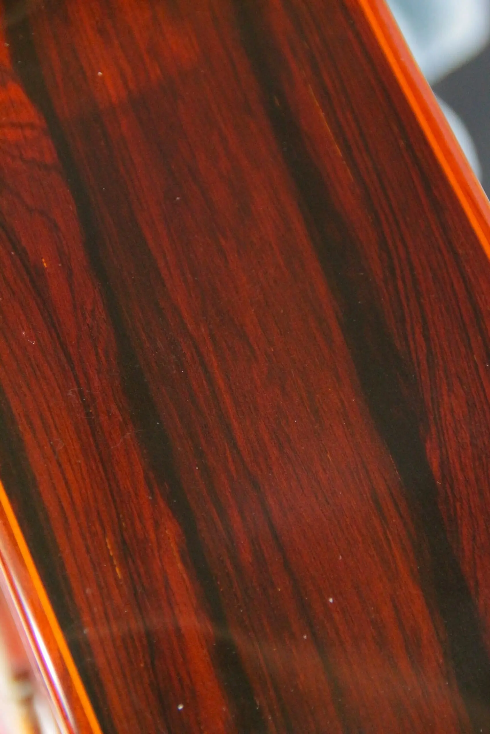 Diese Jose Romero 1996 Flamenco Gitarre ist gut eingestellt und spielt sich sehr schön. Sie hat eine 660 mm Mensurlänge und eine 52 mm Sattelbreite. Die Decke ist aus Fichte und der Boden und die Zargen aus schönem Cocobolo Palisander.