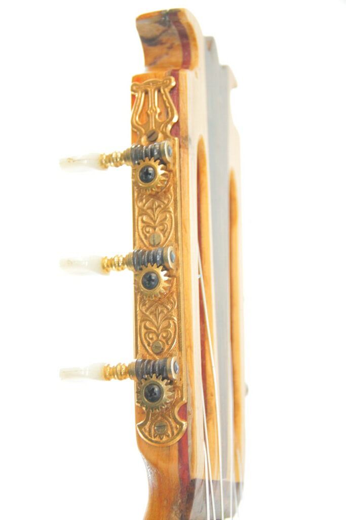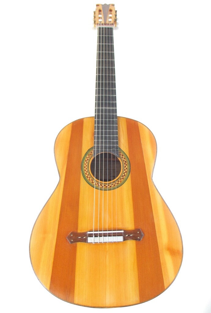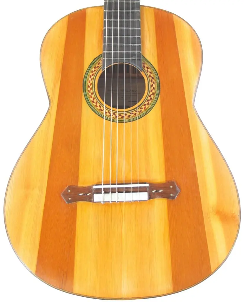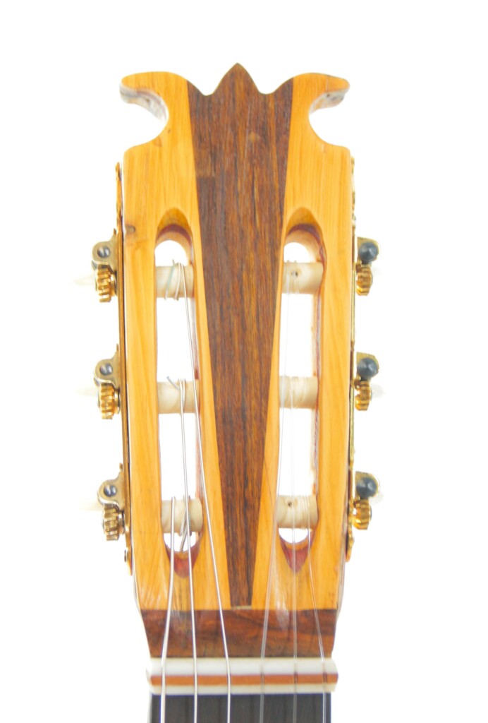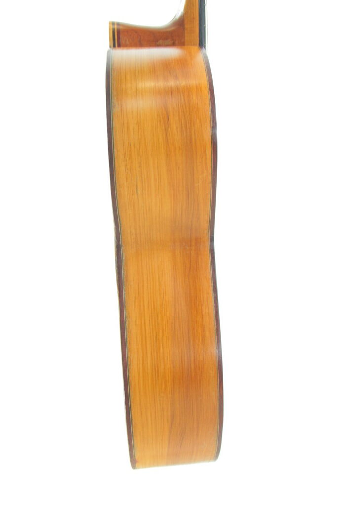 Die Decke dieser Gitarre ist aus Fichte, mit 2 Streifen aus Zeder. Die Zargen sind aus Zypresse. Der kunstvoll gestaltete Boden ist aus verschiedenfarbigen Palisander – und Zypresseteilen. Die Mensur beträgt 650 mm und die Sattelbreite 50 mm. Das Halsprofil ist recht kräftig und eignet sich gut für Gitarristen mit großen Fingern.