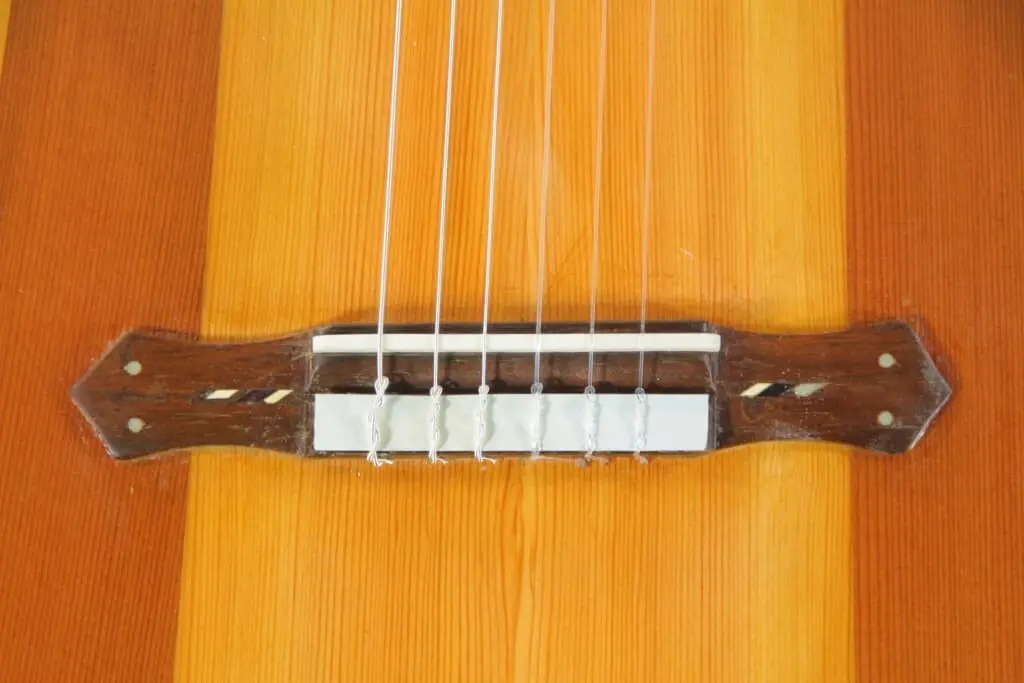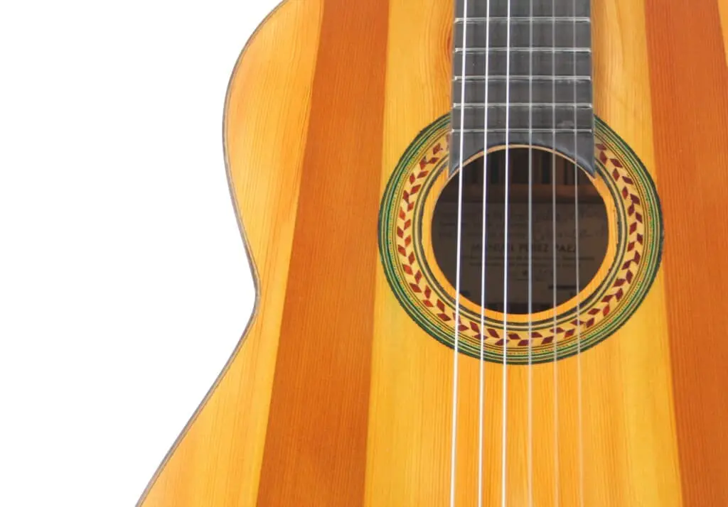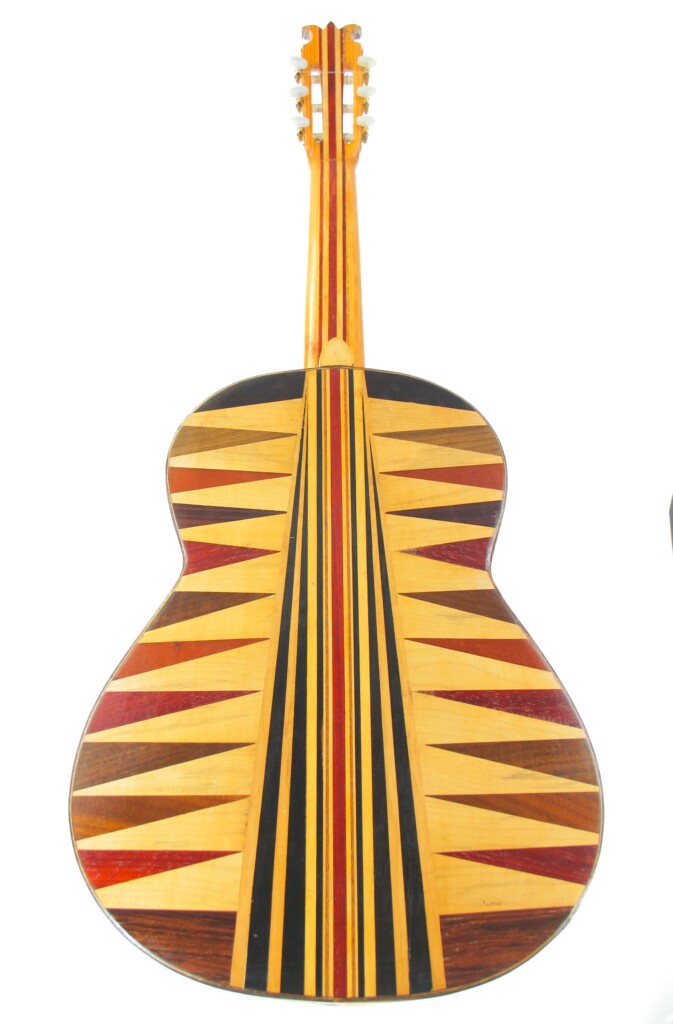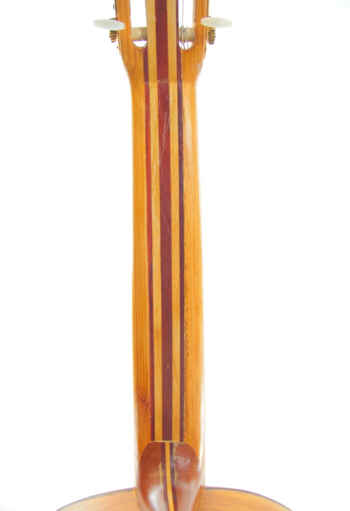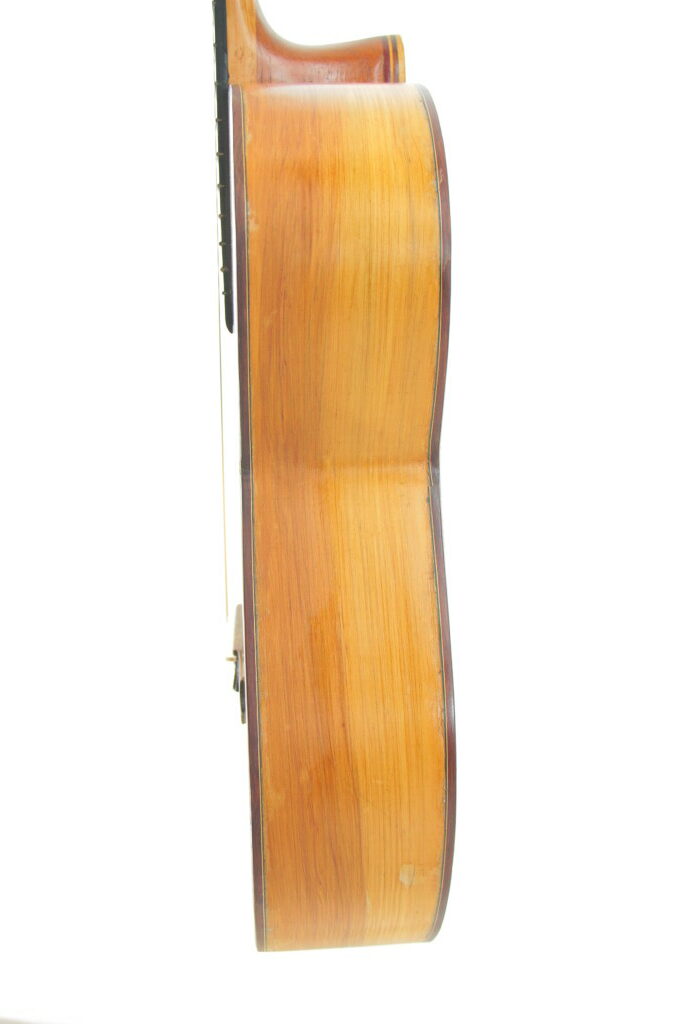 Die Decke dieser Gitarre ist aus Fichte, mit 2 Streifen aus Zeder. Die Zargen sind aus Zypresse. Der kunstvoll gestaltete Boden ist aus verschiedenfarbigen Palisander – und Zypresseteilen. Die Mensur beträgt 650 mm und die Sattelbreite 50 mm. Das Halsprofil ist recht kräftig und eignet sich gut für Gitarristen mit großen Fingern.