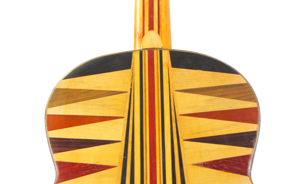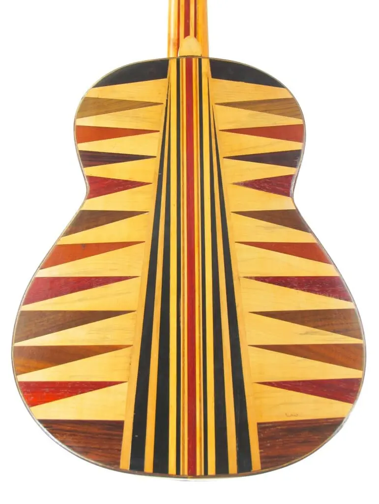 Diese Gitarre aus 2008 ist eines dieser unglaublich reich verzierten Instrumente. Man kann sich kaum vorstellen, wieviele Stunden dafür verwendet wurden um die Holzteile im Mosaikstil zusammenzufügen.