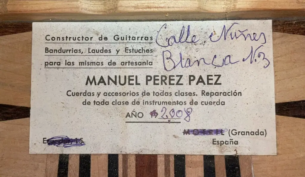 Manuel Perez Paez wurde 1925 in Motril (Granada) geboren. In den 50’er Jahren begann er bereits mit dem Gitarrenbau und lernte bei verschiedenen Gitarrenbauern in Granada.