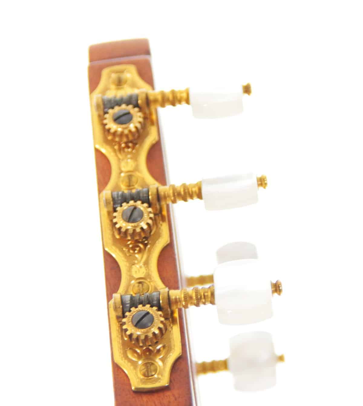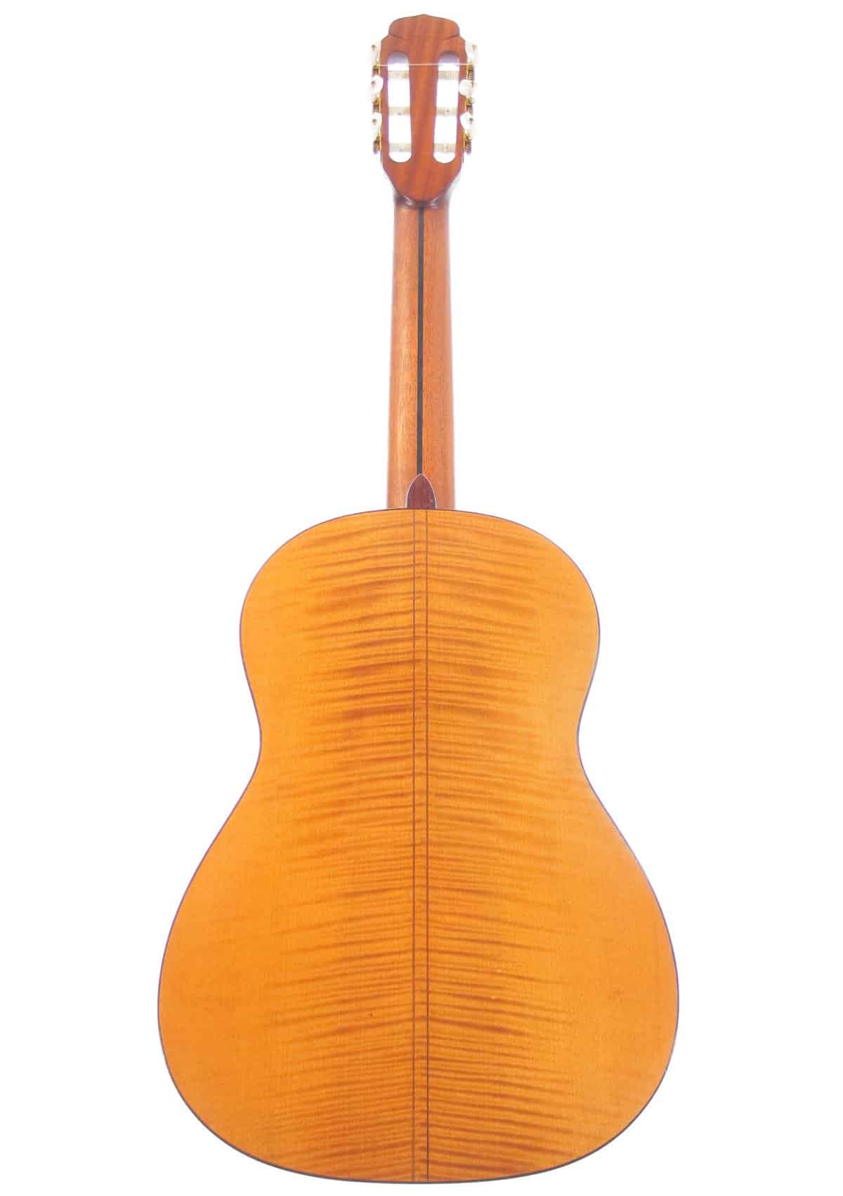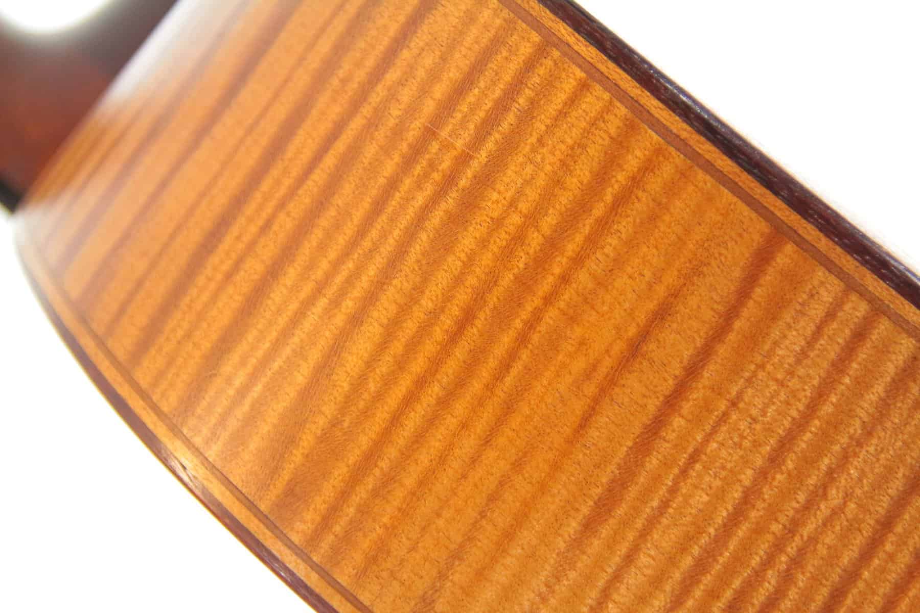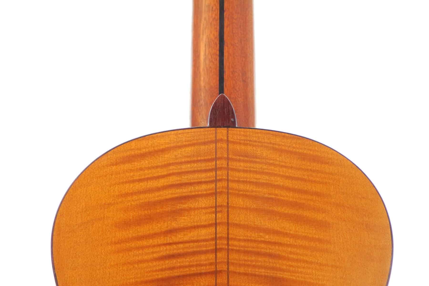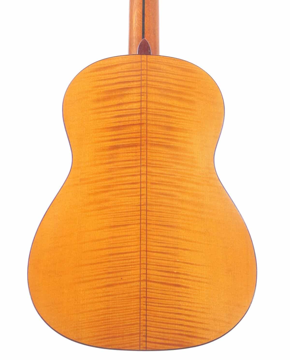 Der Korpus ist aus Ahorn, kombiniert mit einer Fichtendecke, Mahagoni-Hals mit 650 mm Mensur, 52 mm Sattelbreite, Ebenholz-Griffbrett, Palisander-Steg mit geteiltem Sattel, ovalem Schallloch und Alessi-Mechaniken.