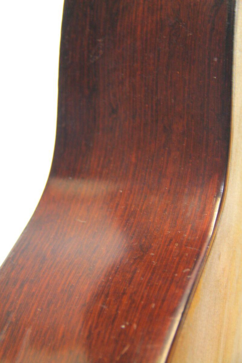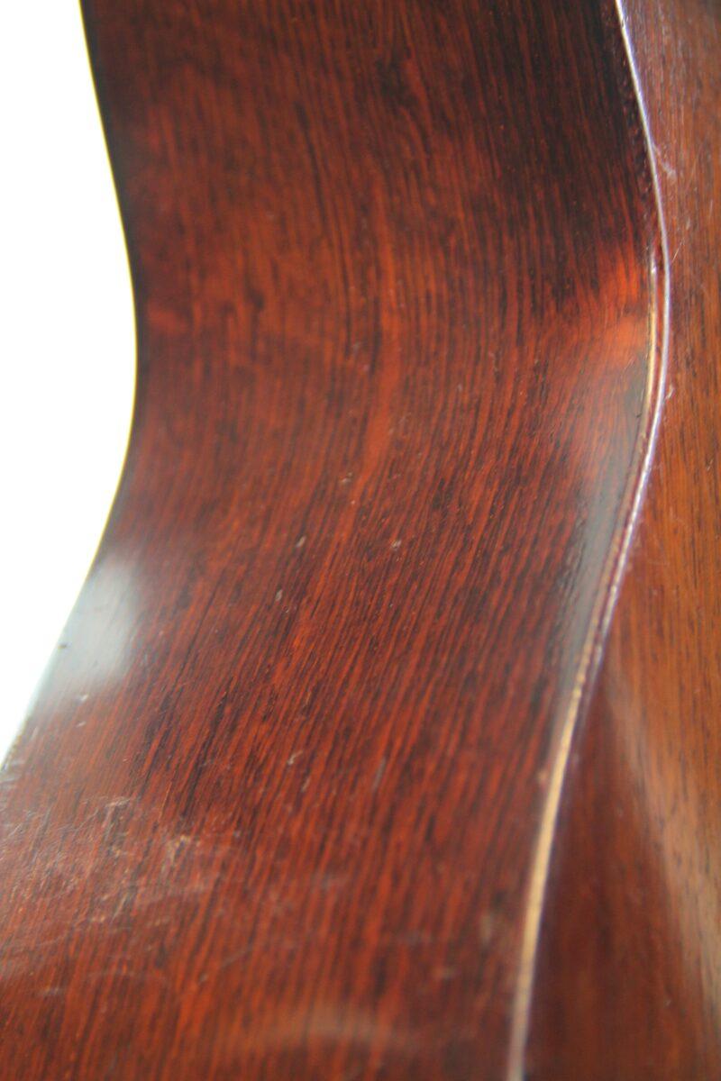 Für die Decke dieser Gitarre wurde ein schönes Stück Fichte mit einer sehr geraden Maserung verwendet. Der Boden und die Zargen sind von hoher Qualität und sehr schönem Rio Palisander.