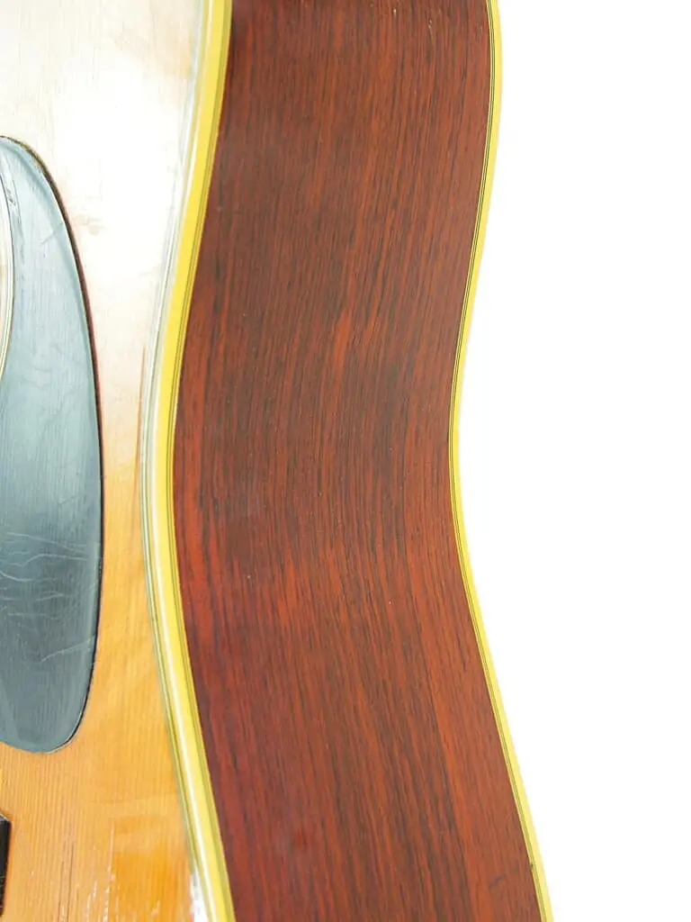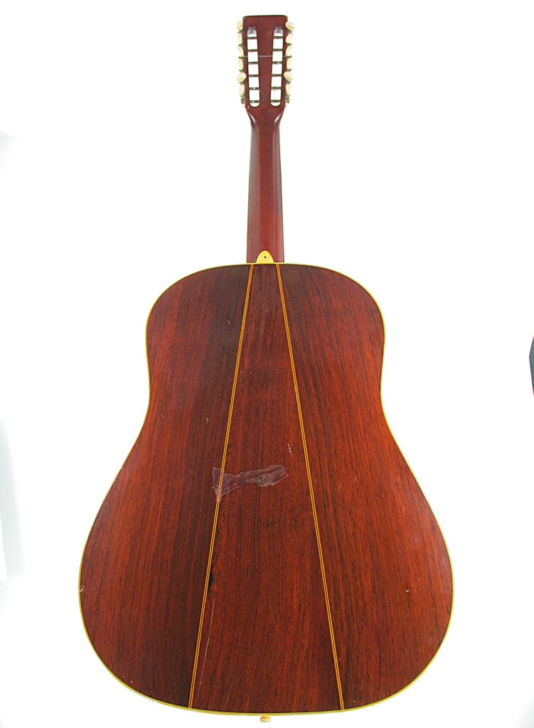 Diese schönen roundshoulder Gitarren wurden von Johnny Cash, Judy Collins, Ernest Tubb gespielt … nur um ein paar zu nennen. Sie ist im Grunde wie eine 6-saitige D-35 konstruiert, hat aber einen Roundshoulder-Korpus und 12 statt 14 Bünde frei vom Korpus.