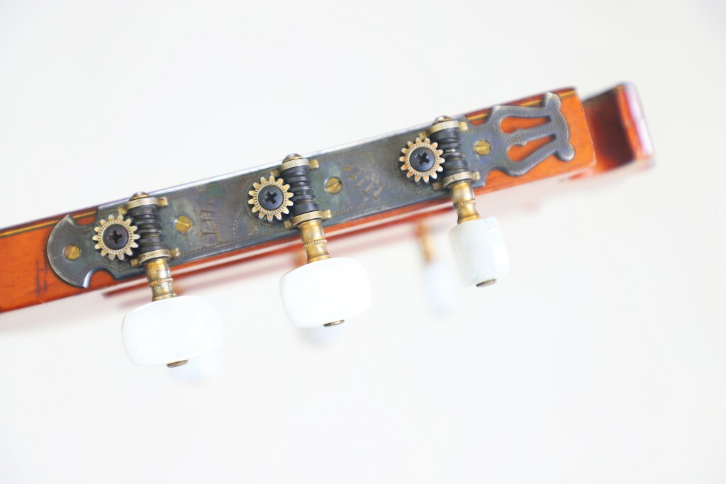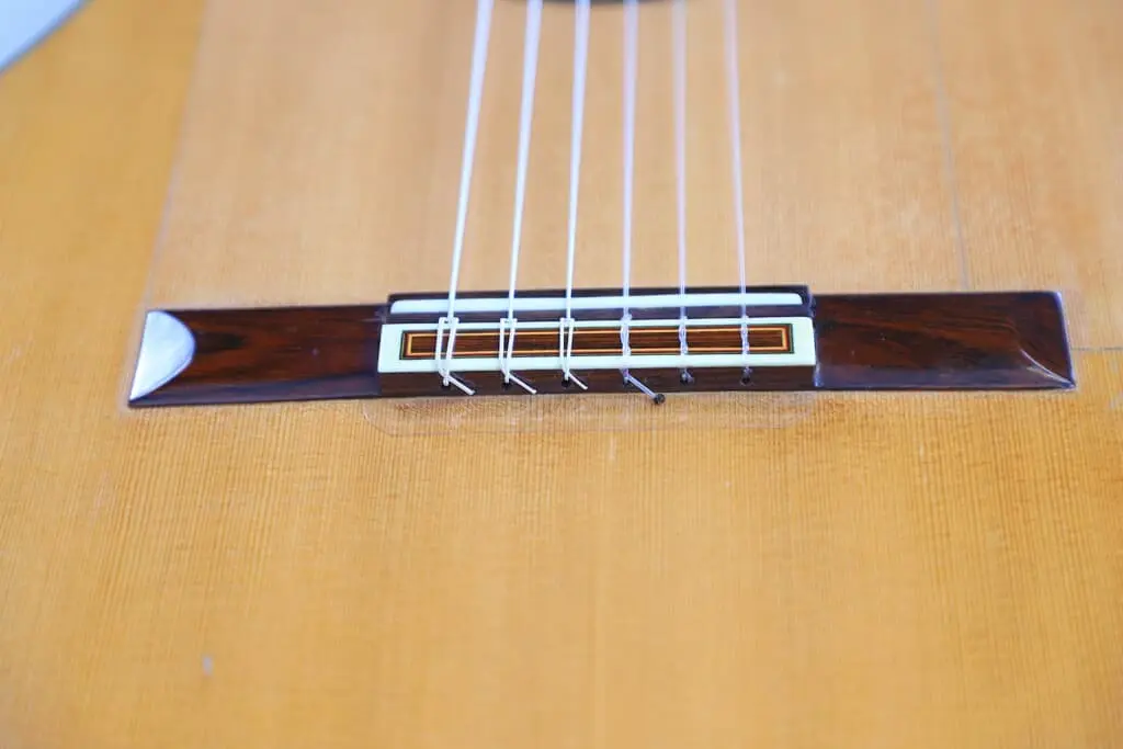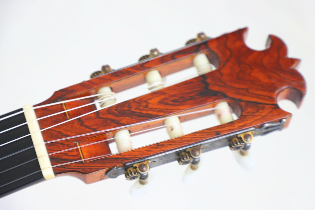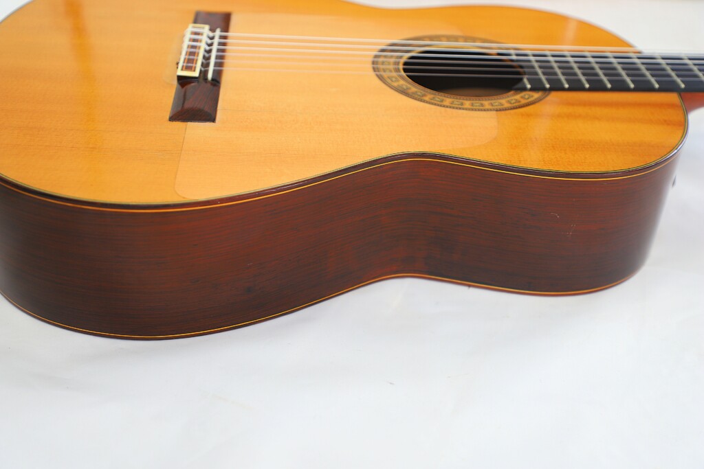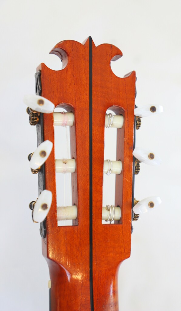 Mit einer Mensurlänge von 650 mm und einer Sattelbreite von 52 mm spielt sich die Gitarre mühelos. Die Gitarre befindet sich in einem sehr guten Zustand für ihr Alter (nur eine kleine Reparatur an der Decke) und ist perfekt eingestellt, mit einem geraden Hals und niedriger Saitenlage (2,8 mm E und 2,3 mm e am 12. Bund), was eine hervorragende Spielbarkeit garantiert.