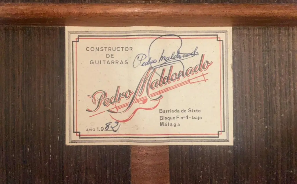 Pedro Maldonado wurde 1929 in der Las Parras Straße in Loja, Granada, geboren. Sein Vater war Möbeltischler, und Pedro begann schon als Teenager, ihm in der Werkstatt zu helfen. Es dauerte nicht lange, bis Pedro ein starkes Interesse am Gitarrenbau entwickelte. Sein Vater erkannte seine Leidenschaft und brachte ihn nach Granada, damit er seine Fähigkeiten unter der Anleitung von Meistergitarrenbauern der renommierten „Escuela Granadina“ verfeinern konnte. Dort lernte und arbeitete Pedro mit berühmten Kunsthandwerkern wie Manuel de la Chica, Eduardo Ferrer und Antonio Robles. 1959 eröffnete er schließlich seine eigene Werkstatt.