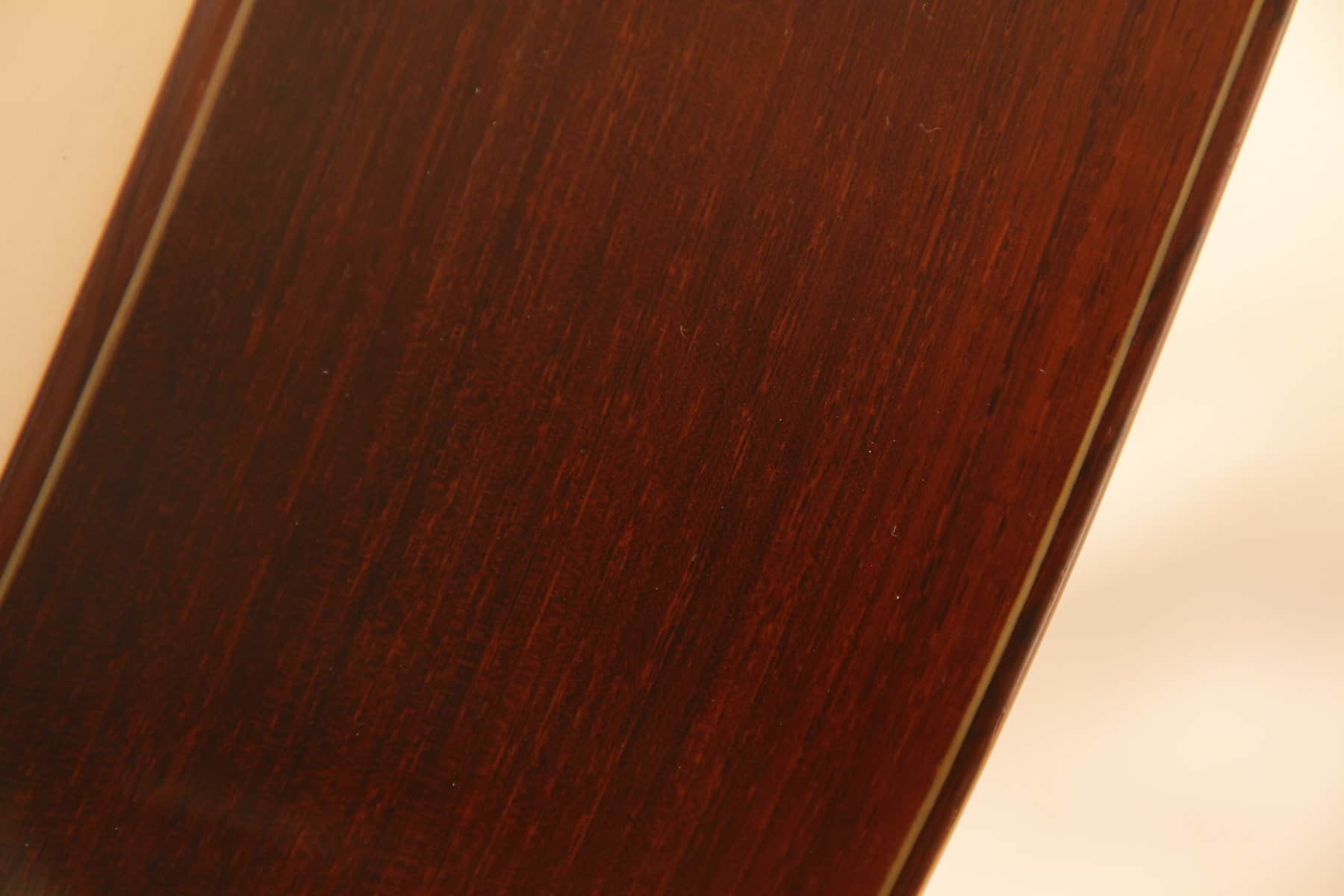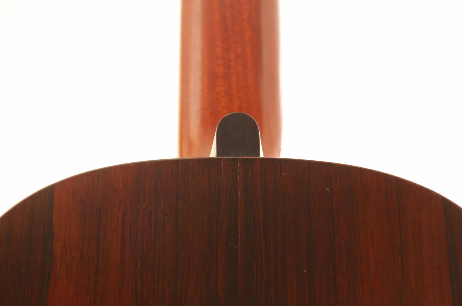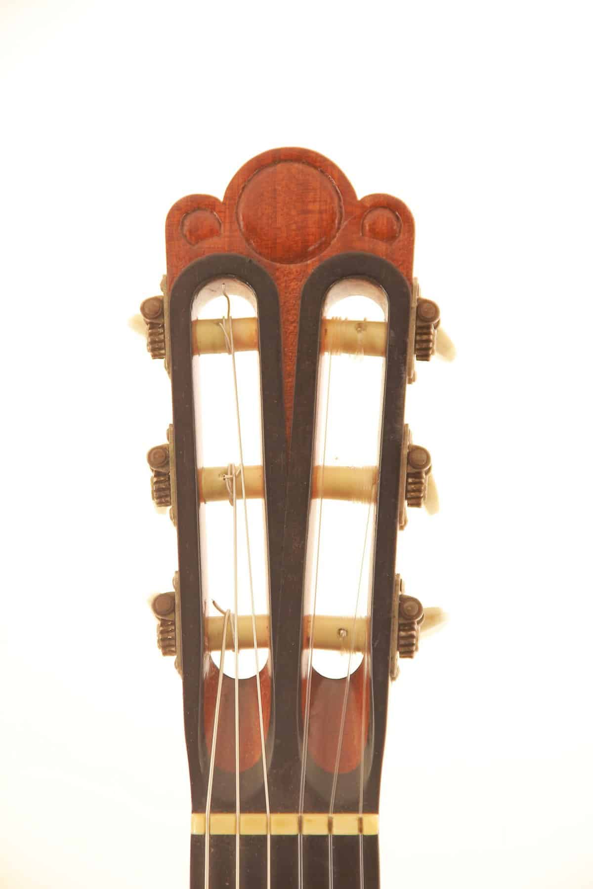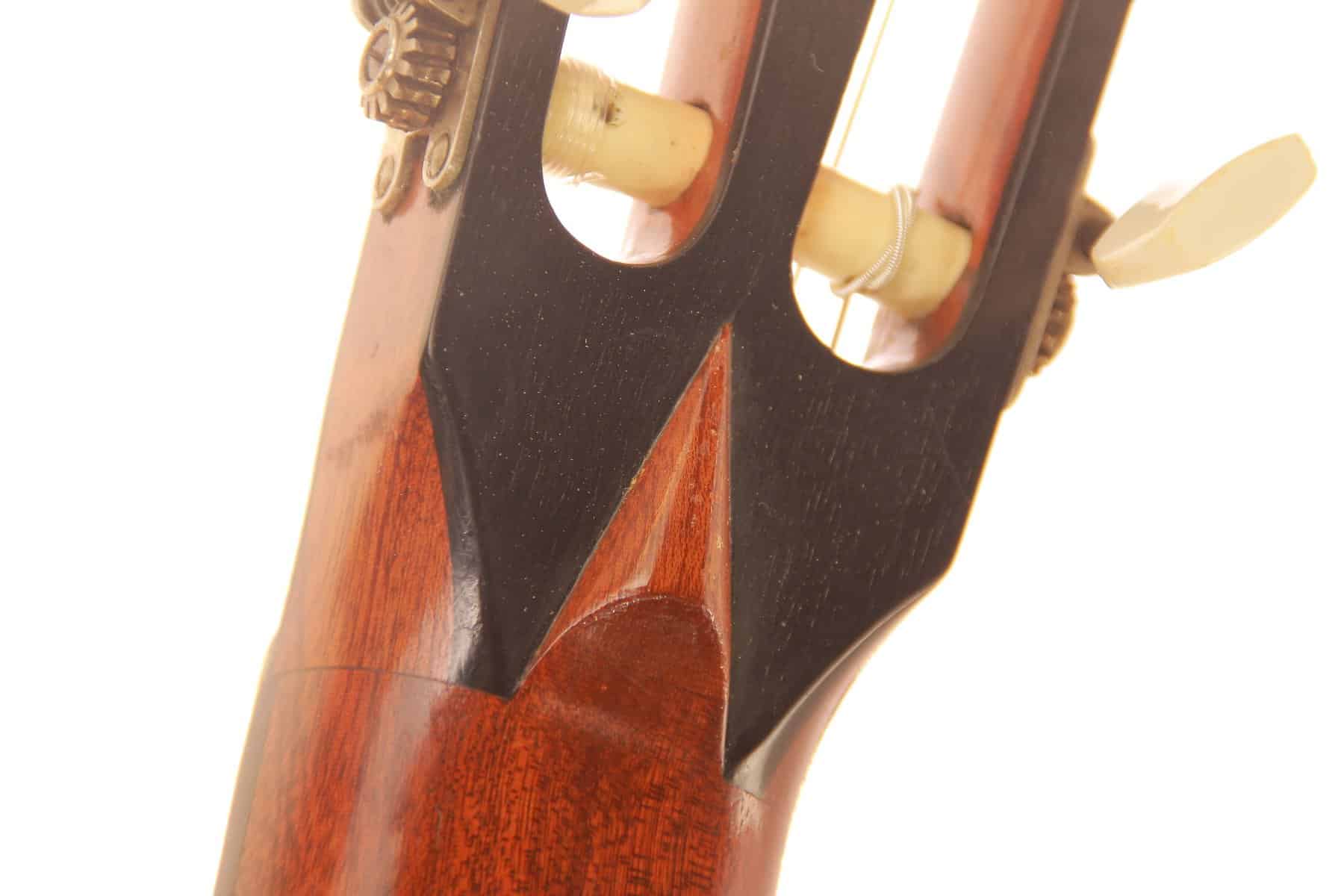 Der wunderbar geschnitzten Kopf mit Ebenholzfurnier ist absolut herausragend und wunderschön verarbeitet. Die Gitarre hat die für Weißgerber typische Drei-Fächerbeleistung. Die Decke ist aus feiner Fichte und Boden und Zargen aus grandiosem Palisander.