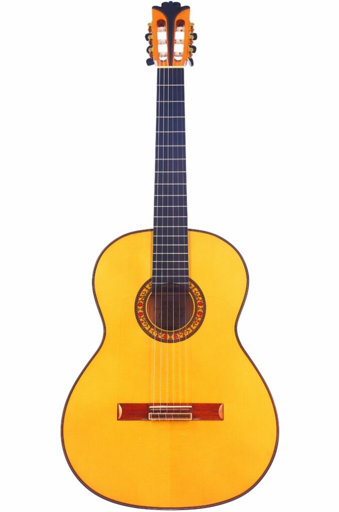 Mit einer Mensur von 650 mm, einer Sattelbreite von 52 mm und einer komfortablen Saitenlage am 12. Bund bietet dieses Instrument exzellente Spielbarkeit für anspruchsvolle Flamenco Techniken. Die speziell entwickelte Zargenhöhe von 95 mm sorgt für zusätzliche Bequemlichkeit und Projektion und macht die Gitarre auch bei langen Spielsitzungen angenehm. Der Cedro-Hals, verstärkt mit Ebenholz, bietet Stabilität und Präzision, während das Griffbrett aus Ebenholz für Haltbarkeit und Eleganz sorgt. Ausgestattet mit handgefertigten goldenen Mechaniken und einem traditionellen Flamenco-Golpeador ist dieses Instrument sowohl optisch eindrucksvoll als auch technisch makellos.