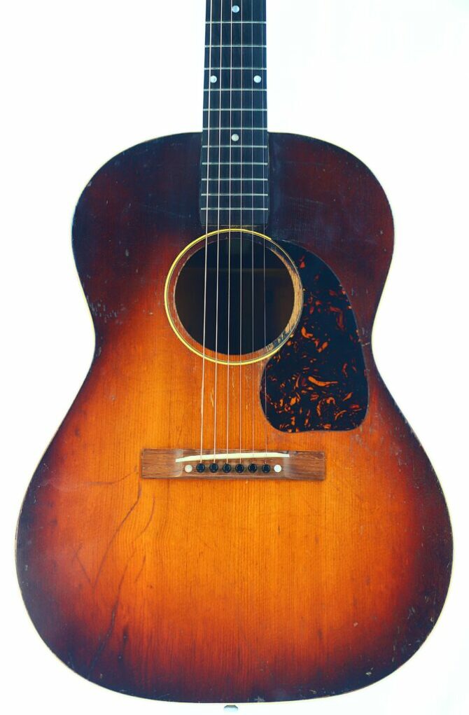 Diese Gibson LG-2 1946 Akustik Gitarre ist für ihr Alter in einem sehr guten Zustand – sie hat die normalen Alterungserscheinungen im Lack und einige Gebrauchsspuren durchs Spielen. Ein paar alte Risse wurden repariert und sind stabil. Wir haben die Reparaturen überprüft. Die Saitenlage liegt bei 2,3 mm E und 1,8 mm E am 12. Bund. Die Stegeinlage hat noch genug Platz für zukünftige Anpassungen. Sie hat einen tollen Hals (dicker, genau wie die Hälse aus der Kriegszeit) mit 44,5 mm Sattelbreite.