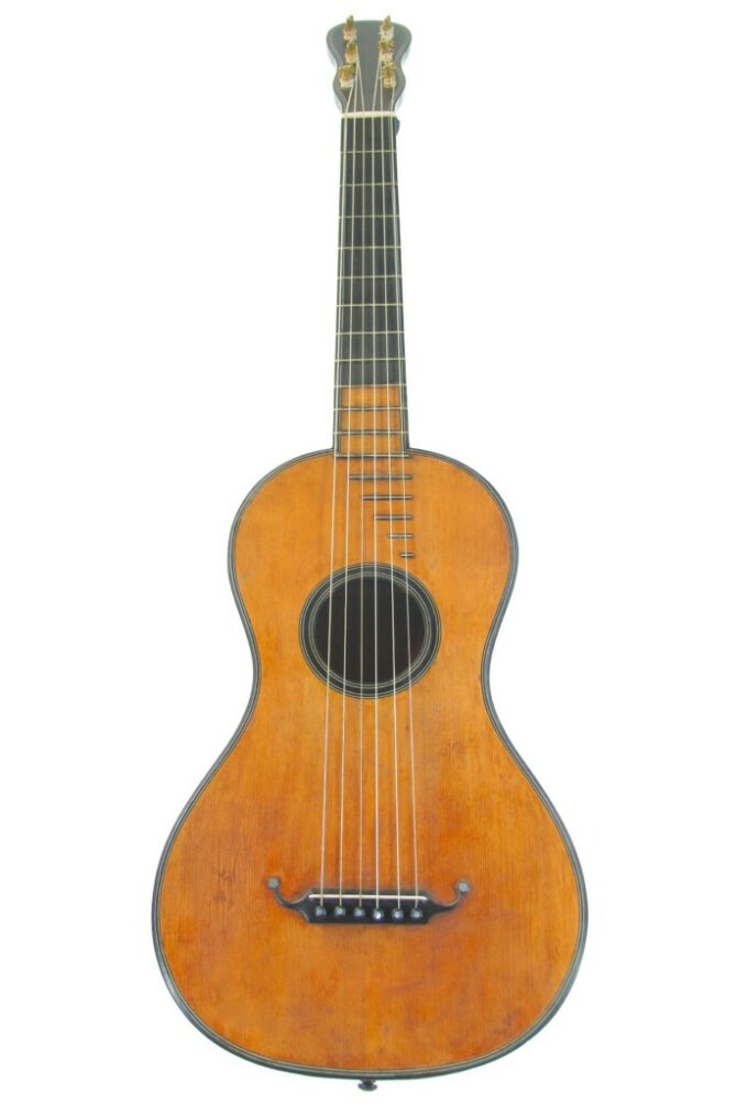 Deze prachtige gitaar, die rond 1815 werd gebouwd, is een zeldzaamheid. Hij heeft een spruce bovenblad en esdoorn achter- en zijkanten. De fijne mechanieken zijn getrouwe reproducties van de originelen. Hij is in verbazingwekkende staat voor zijn leeftijd en heeft alleen een kleine reparatie aan het bovenblad. De gitaar speelt geweldig, met een rechte hals en een aangenaam lage actie.