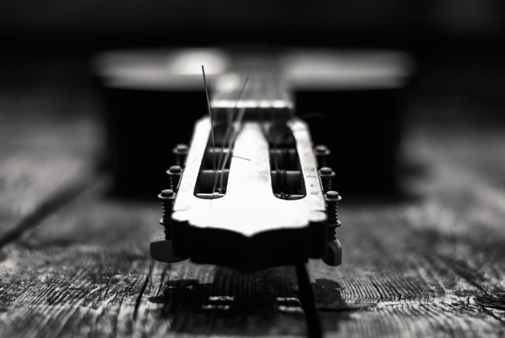 Nylon Strings Vs. Carbon Strings: Understanding The Differences - Close-Up, Black-And-White Photo Of A Vintage Guitars Bridge And Strings, With Bold Text Above Reading, The Amazing World Of Vintage Guitars. A Website Url Appears At The Bottom: Www.vintage-Guitar-World.com.