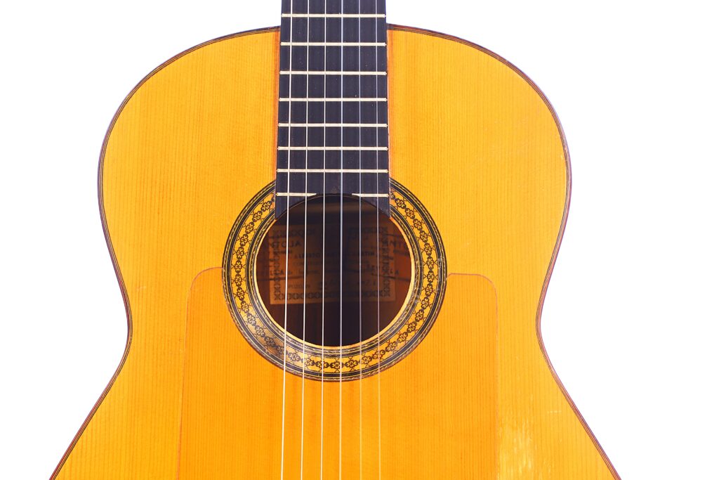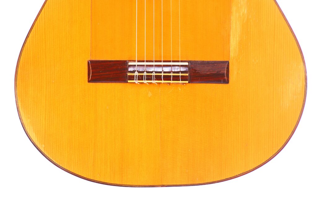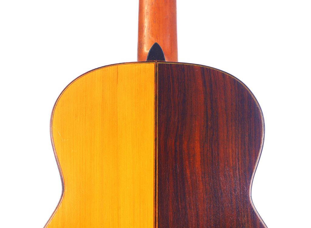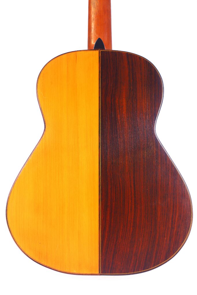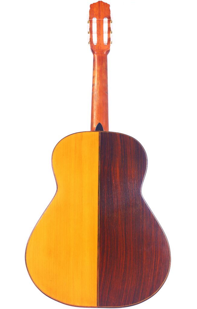 This guitar is a rare and special flamenco model, as it has a spruce (top)/rosewood (back)/Cypress (side) construction in the bass range, which gives it very distinctive, clear and powerfull bass tones, while the spruce (top)/cypress (back)/rosewood (sides) construction gives the trebles sharpness and spontaneity.