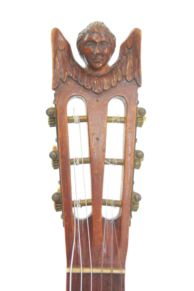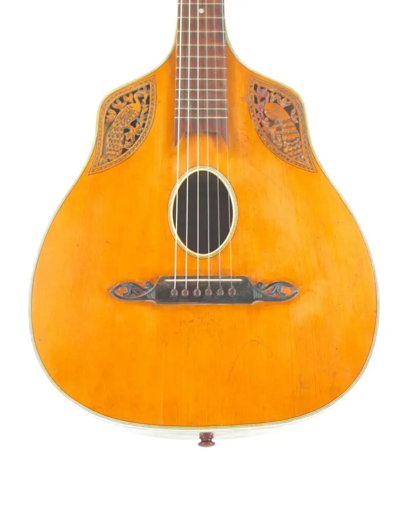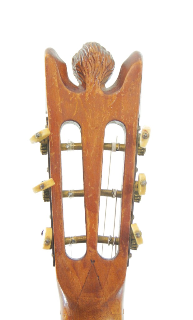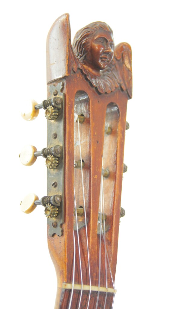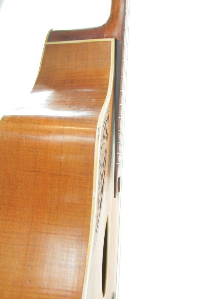 This guitar is a fine example of a coat of arms guitar. It has some paralells to Hauser’s instruments and has beautiful wood carvings on the head and on the top. The fretboard is lightly scalloped and the neck is floating above the top.