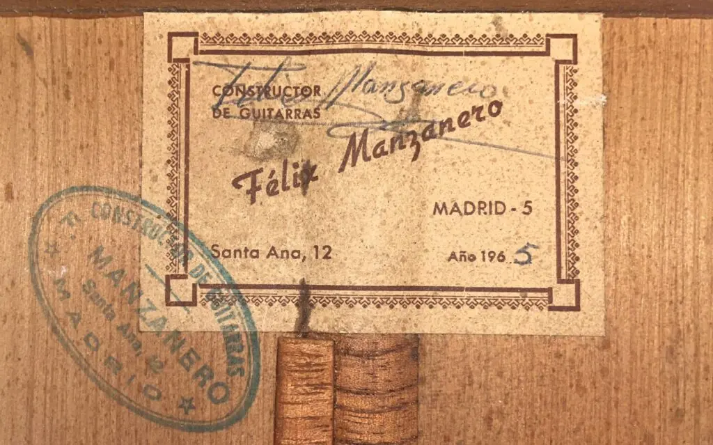 This exceptional 1965 flamenco guitar by Felix Manzanero is a prime example of Madrid’s legendary guitar-making tradition. Manzanero, one of the most revered luthiers in Spain and all of Europe, apprenticed under José Ramirez II, refining his craft to become a master in his own right. After 12 years at the Ramirez workshop, he established his own shop in Madrid in 1963, where he built guitars sought after by world-class musicians.