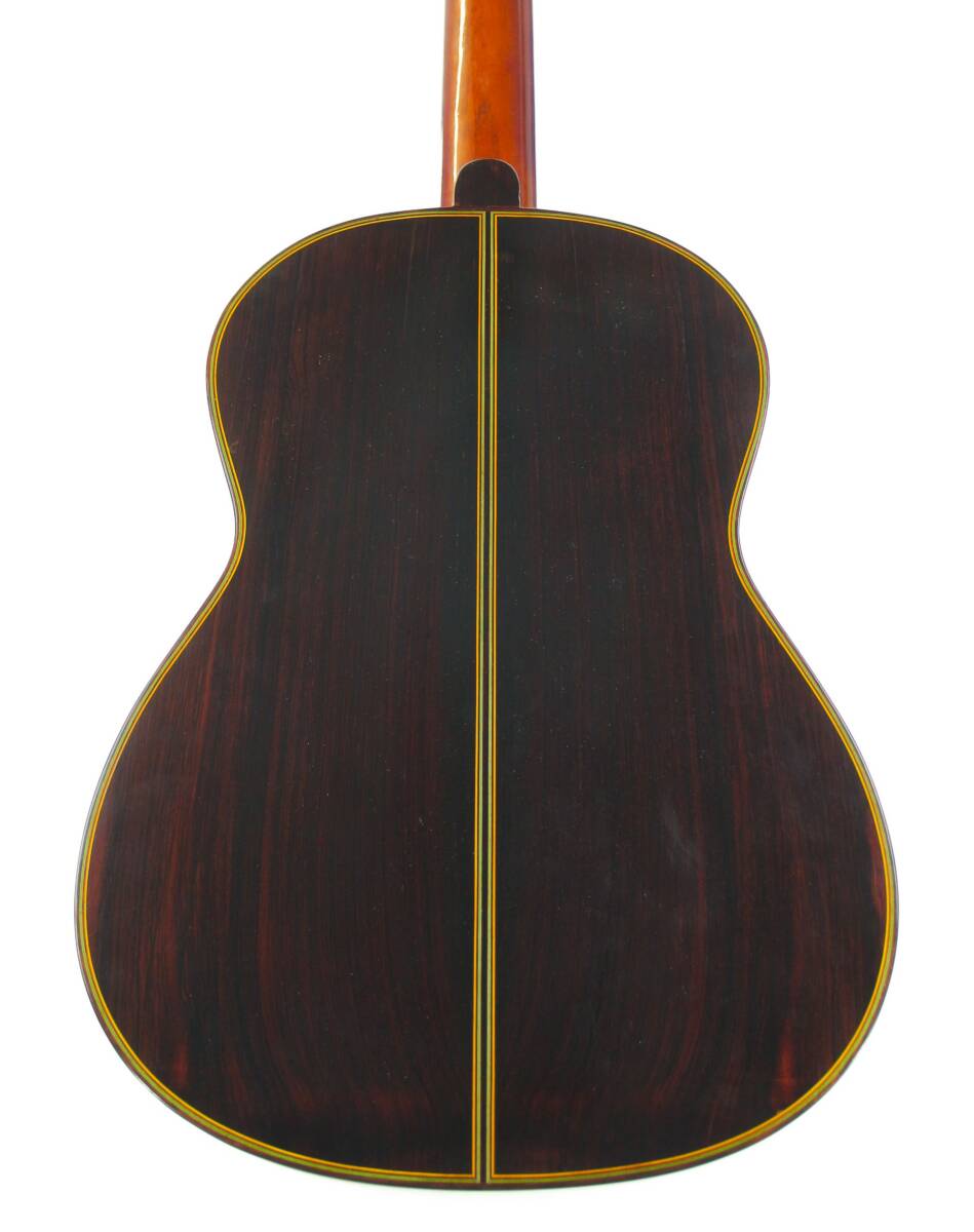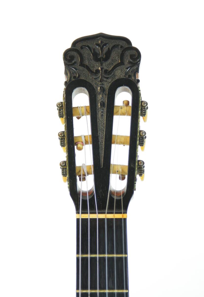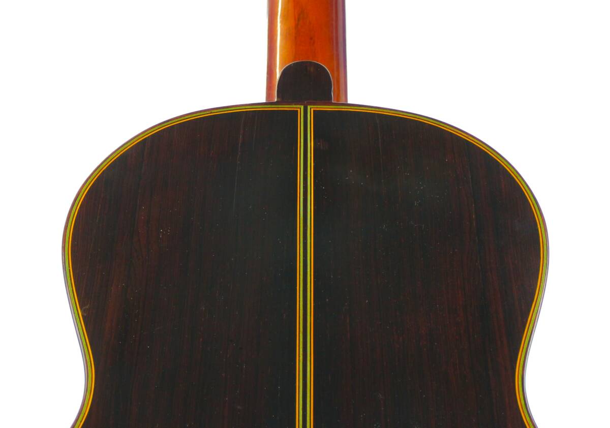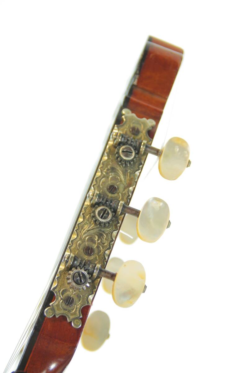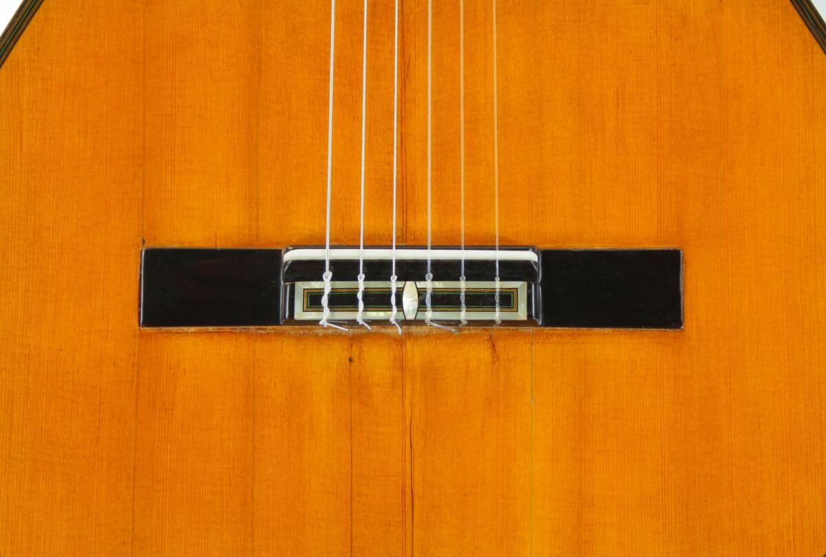 This Francisco Simplicio 1925 classical guitar has an exceptionally fine spruce top. The sides and back are made of very high quality rosewood. The ebony headstock has the typical magnificent carvings and is decorated with the original and extremely high quality tuners. To the delight of collectors, the guitar is still equipped with the original Tornavoz. The scale length is 648 mm and the nut width is 52 mm.