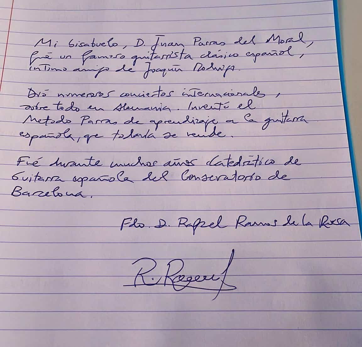 This Francisco Simplicio 1925 classical guitar originally belonged to the famous composer Juan Parras del Moral (1889 – 1973), who received it directly from Simplicio. Juan Parras del Moral was a very close friend of Andres Segovia and is still known today mainly for his famous standard work “Método para guitarra”.