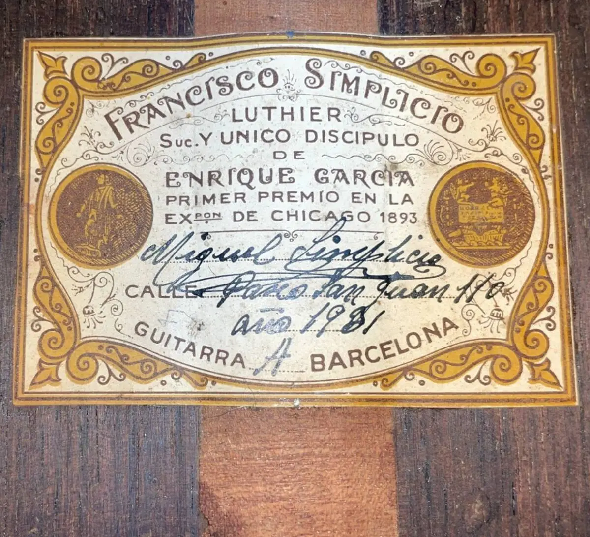 Francisco Simplicio, one of the most respected Spanish guitar makers of the 20th century, was born in Barcelona, Spain in 1874. He first worked as a cabinetmaker and then learned the art of guitar making as an apprentice of the famous luthier Enrique Garcia. When Garcia died in 1922, Francisco Simplicio became the owner of his famous workshop and soon after he won the prestigious prize at the Barcelona International Exhibition.
