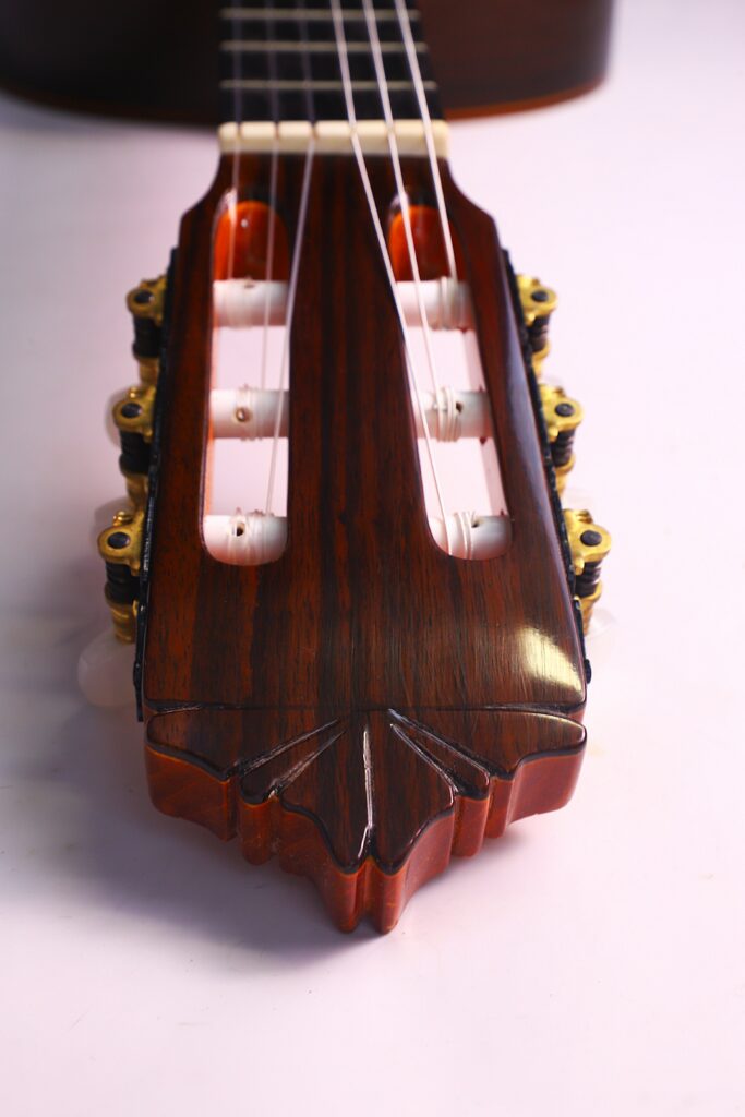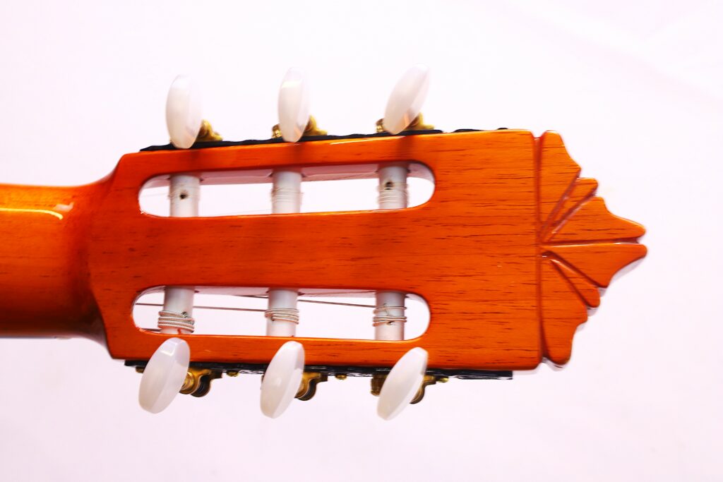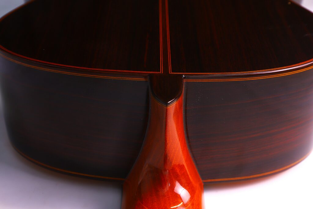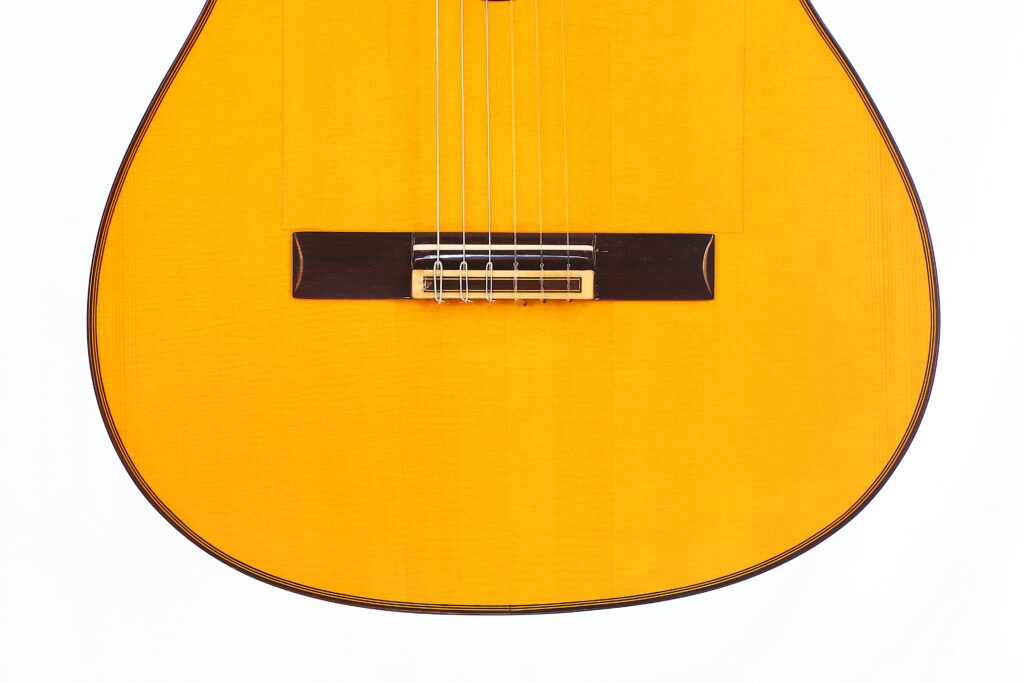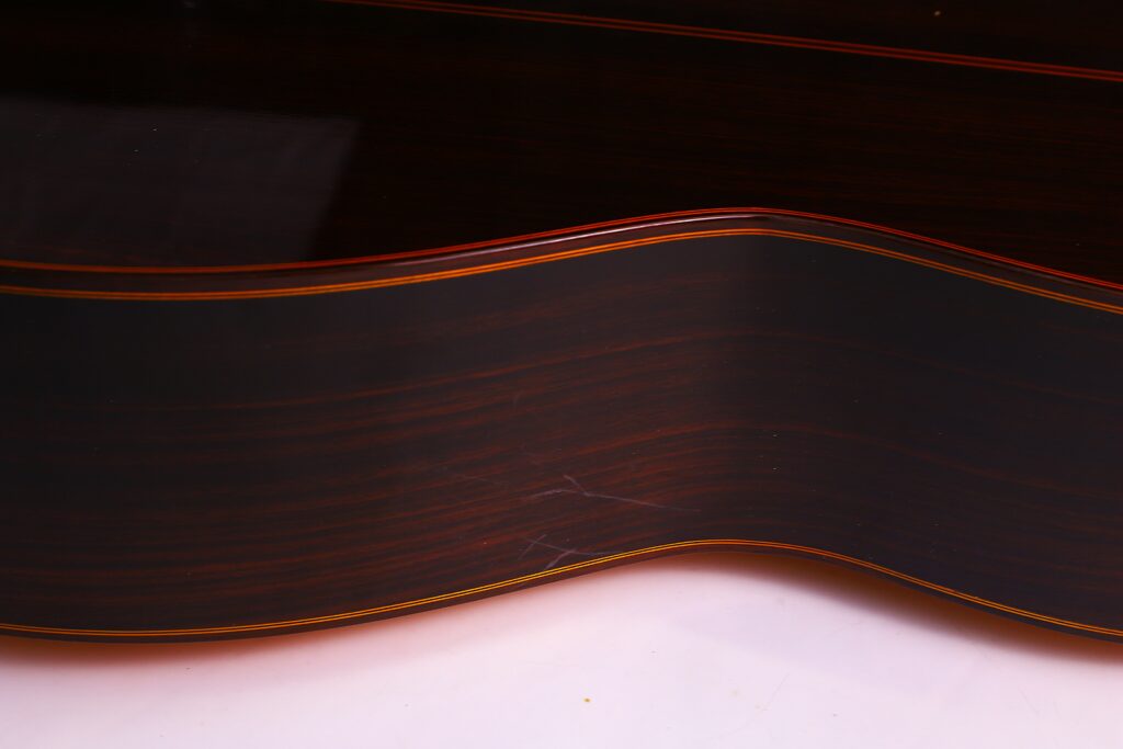 When played softly, the guitar reveals an intimate, almost whispering quality, allowing subtle phrasing and delicate dynamics to shine through. When pushed harder, it transforms into a force of nature, projecting with cutting brilliance and an earthy growl that fills any space – whether in solo performance or ensemble accompaniment. The balance between registers is precise, creating a cohesive and versatile tonal palette.