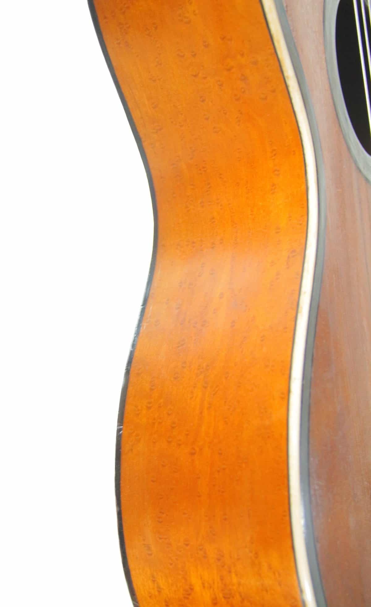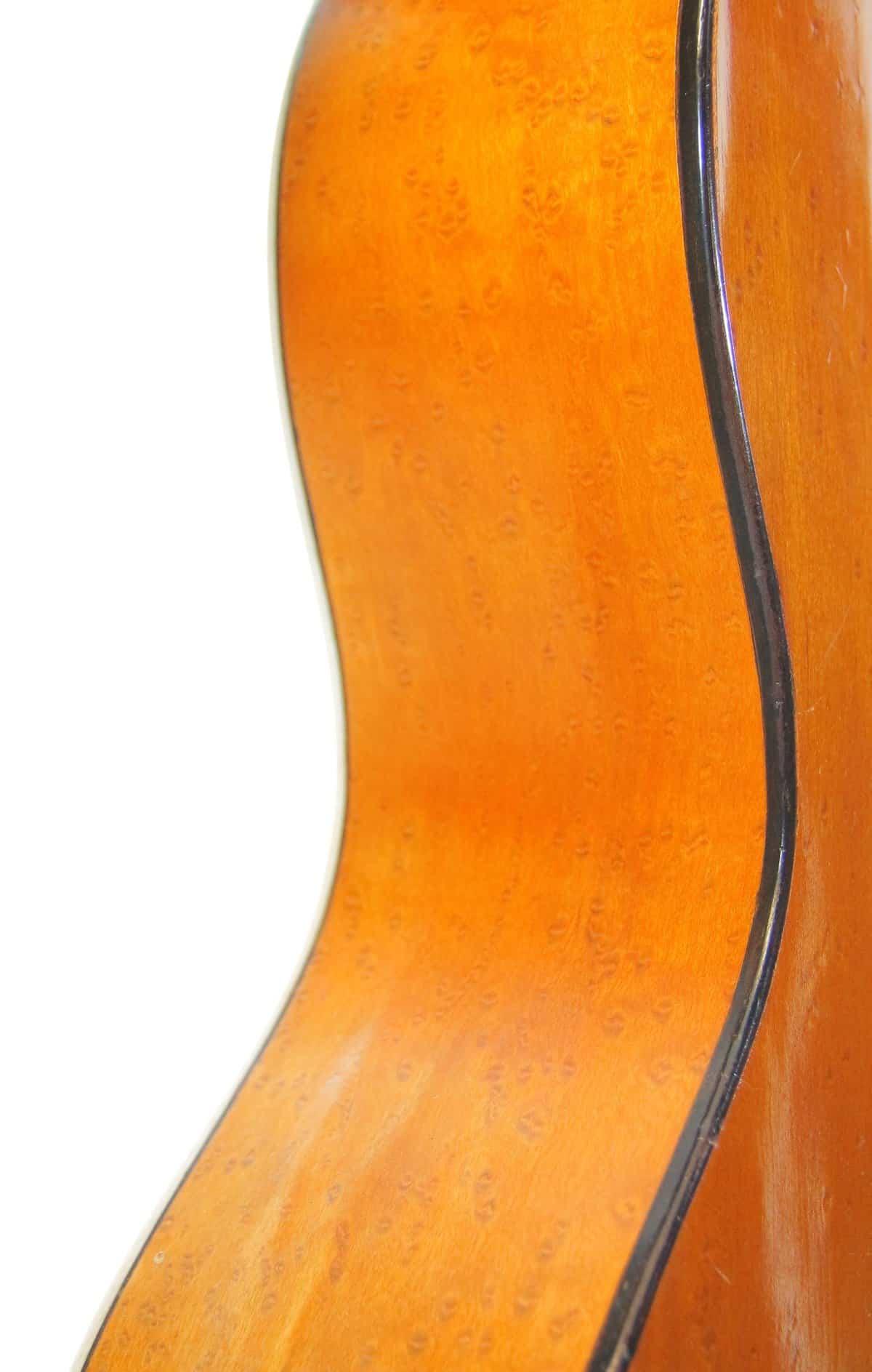 The nut width is 48 mm and the scale length is 645 mm. The top is made of fine spruce, back and sides of extremely beautiful birdseye maple.