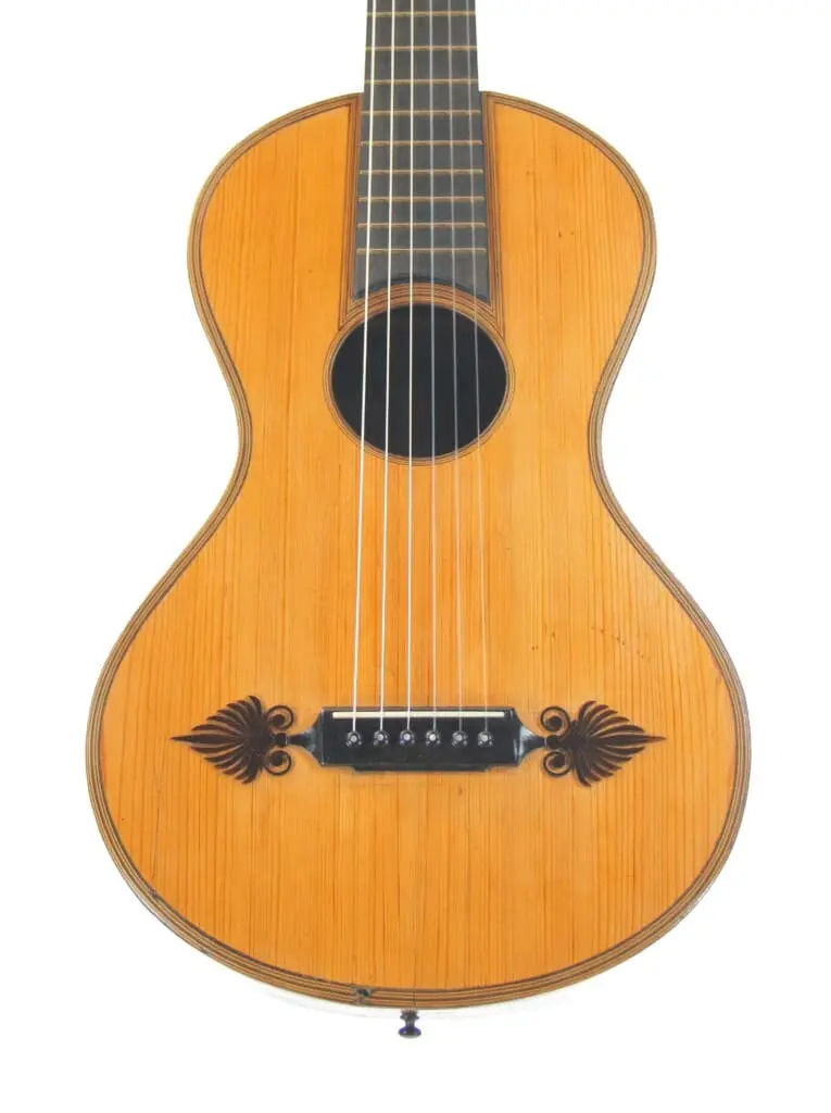 This beautifully crafted Joseph Kriner 1865 romantic guitar has a spruce top and maple back and sides. The scale length is 637 mm and the nut width 47 mm.