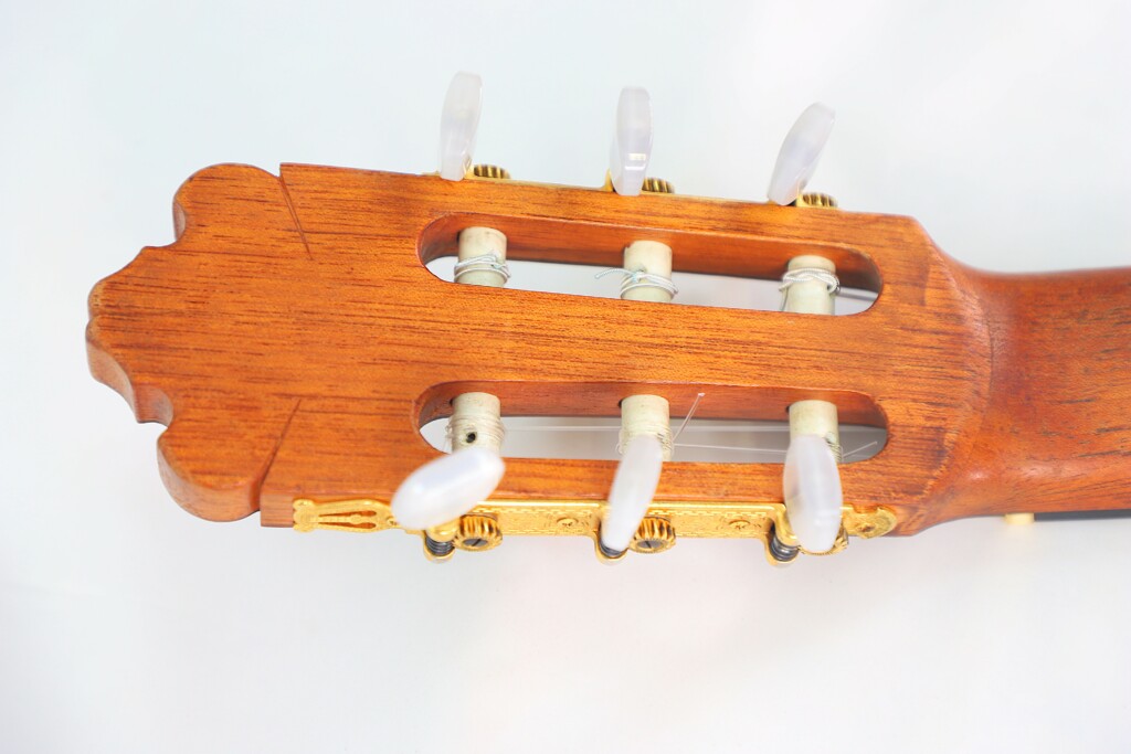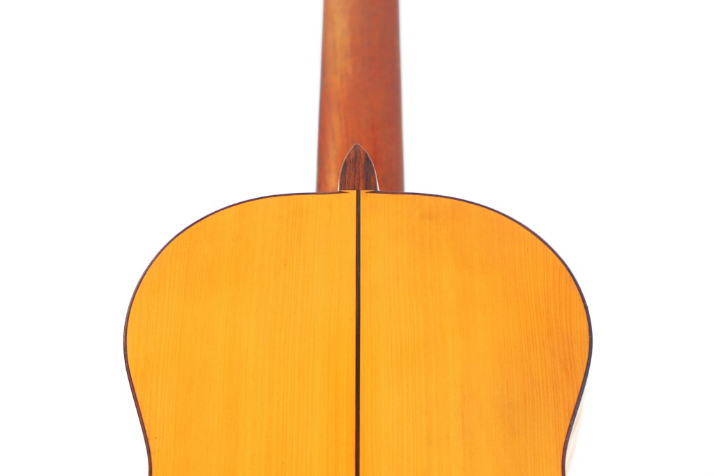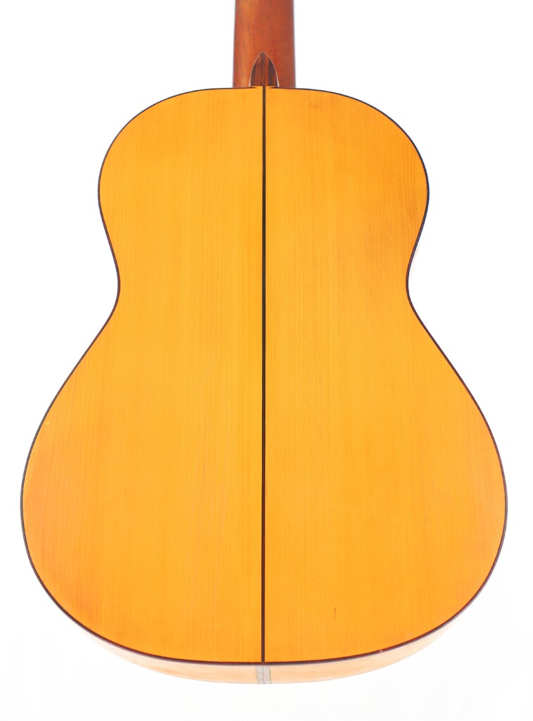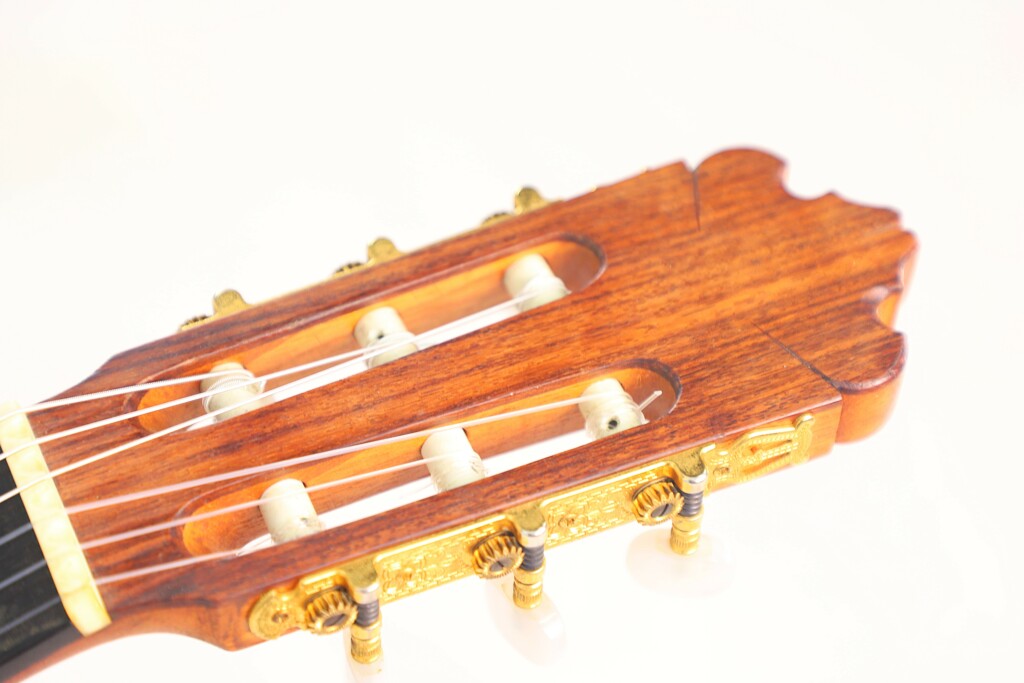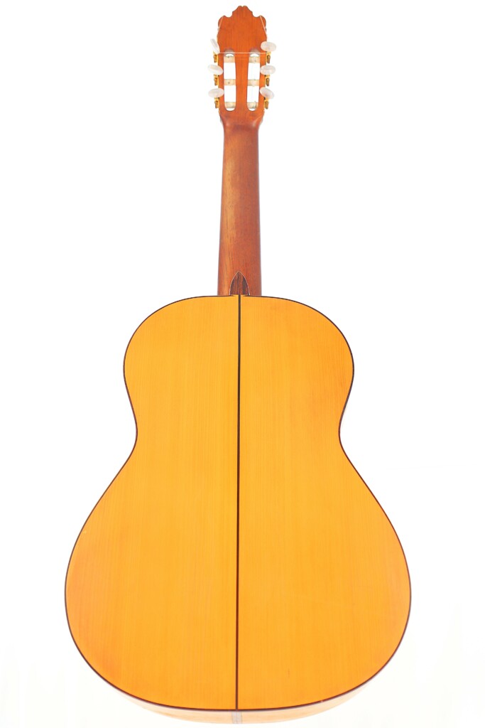 This particular Juan López Aguilarte 2007 flamenco guitar reflects Aguilarte’s meticulous craftsmanship and dedication to quality. It was built with extraordinary care using premium materials. The top is crafted from select German spruce with a beautifully even and straight grain, ensuring remarkable tonal clarity and projection. The back and sides are made from stunningly figured cypress, adding not only visual elegance but also enhancing the guitar’s traditional flamenco sound.