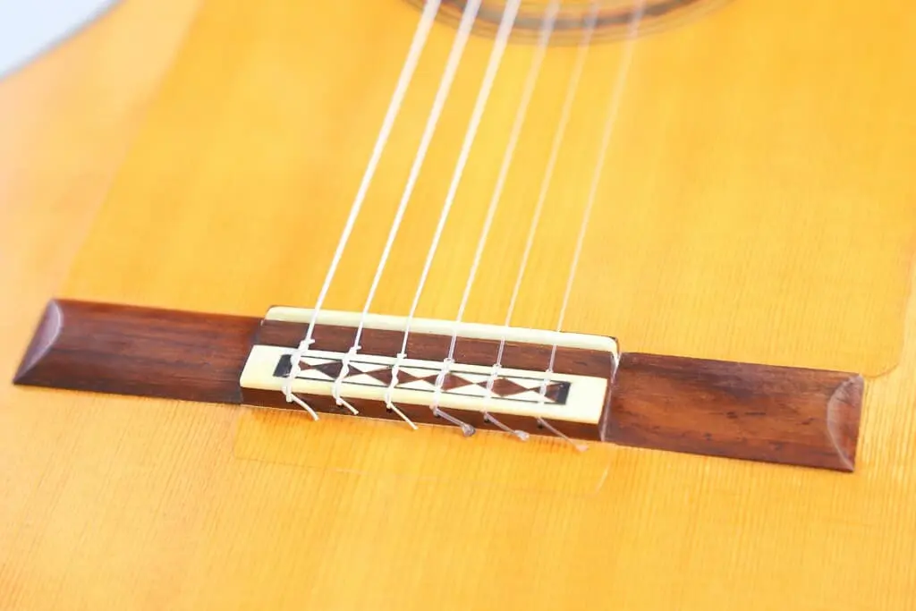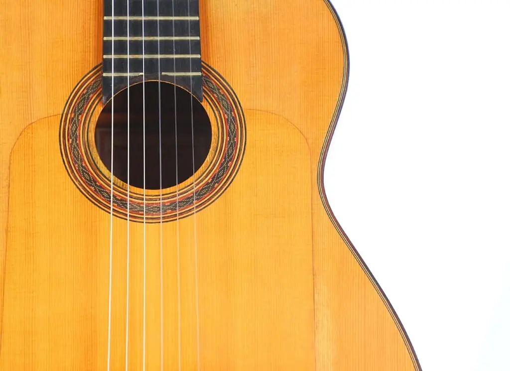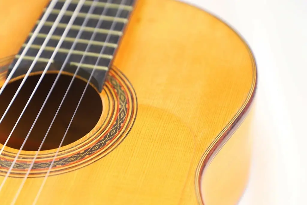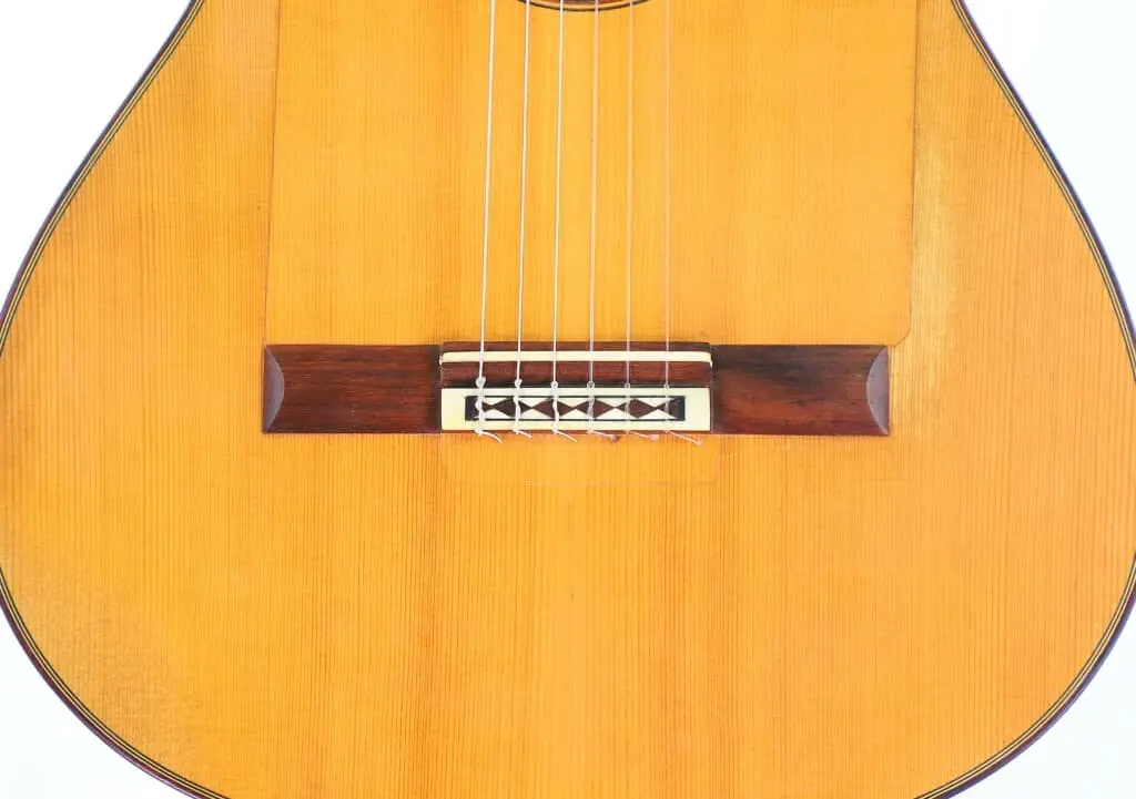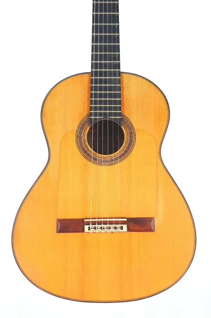 This particular Juan López Aguilarte 2007 flamenco guitar reflects Aguilarte’s meticulous craftsmanship and dedication to quality. It was built with extraordinary care using premium materials. The top is crafted from select German spruce with a beautifully even and straight grain, ensuring remarkable tonal clarity and projection. The back and sides are made from stunningly figured cypress, adding not only visual elegance but also enhancing the guitar’s traditional flamenco sound.
