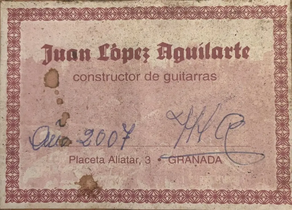 This exquisite flamenco guitar was crafted in 2007 by the renowned luthier Juan López Aguilarte, a master craftsman with deep roots in the Spanish guitar-making tradition. Born in Seville in 1941, Aguilarte moved to Granada in his youth, where he developed his skills as a cabinetmaker before transitioning to the art of lutherie. He honed his craft working with esteemed makers such as Manuel Bellido, Eduardo Ferrer, and Antonio Durán, before establishing his own workshop on Placeta Aliatar 3 in 1979. Though now retired and residing in Armilla (Granada), his legacy lives on through his exceptional instruments.