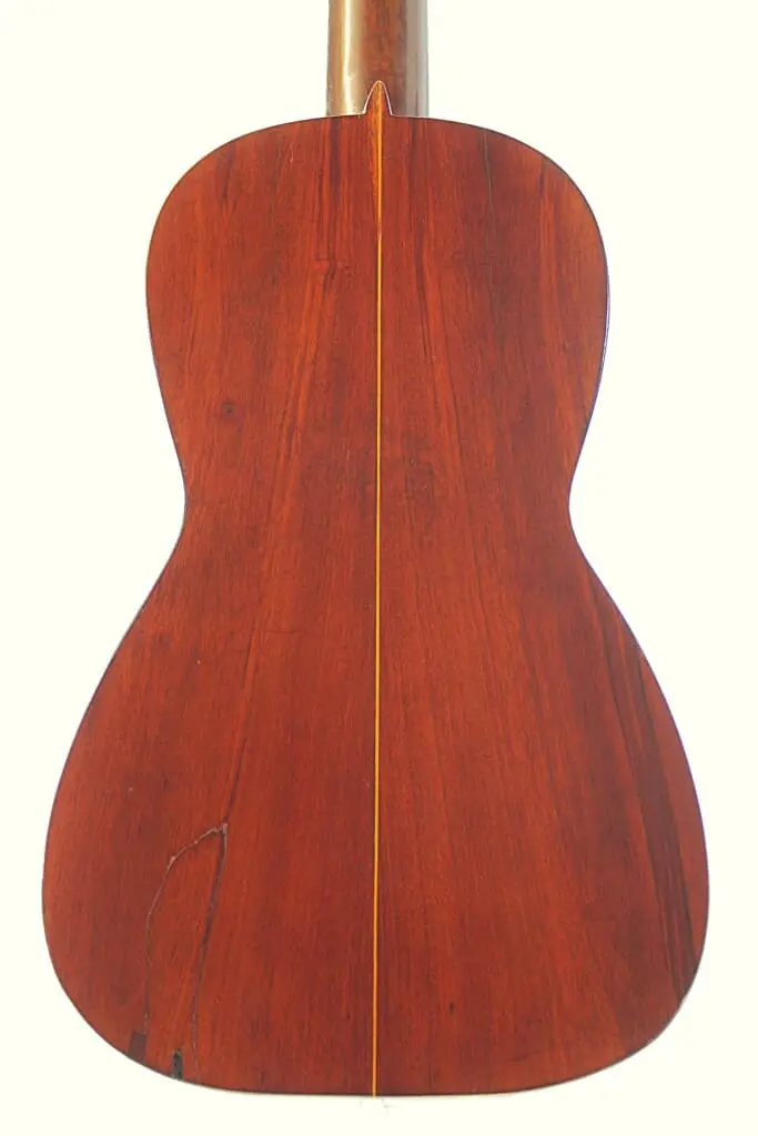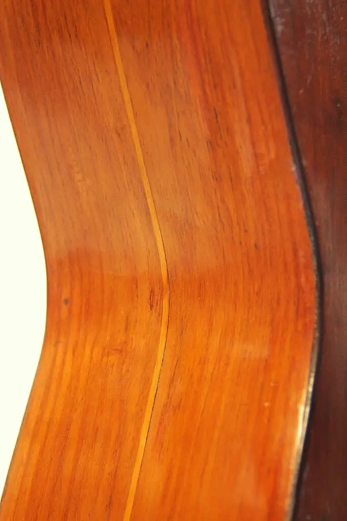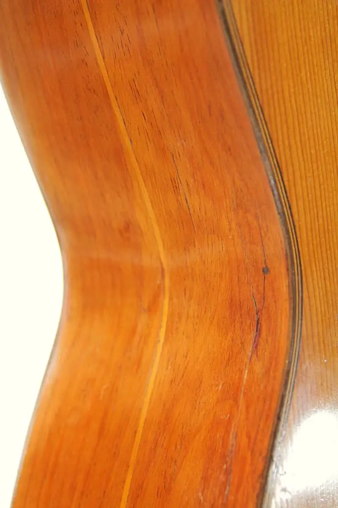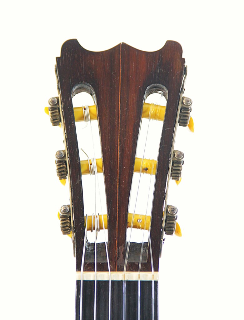 Originally this guitar has been a 12-string (double course) instrument. During the turn of the century these were not popular anymore and as many instruments also this one has been converted to a 6-string guitar. The headstock has been adjusted and the guitar received a new fretboard and a new bridge. All cracks have been repaired and in all this care has been taken to keep the sound and playability at the highest level.