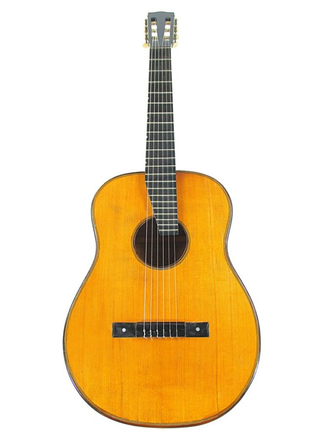 Like Hermann Hauser I, Ludwig Reisinger built the Vienna models to perfection. This guitar is a nice example. The guitar has a top made of  spruce, back and sides made of maple and a fingerboard made of ebony. The scale length is 650 mm and the nut width is 52 mm. The guitar has been restored and some cracks have been professionally repaired. It is also equipped with an adjustable (Stauffer style) neck.