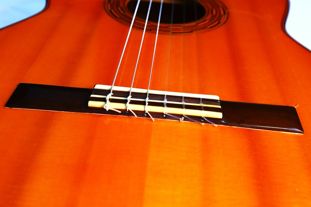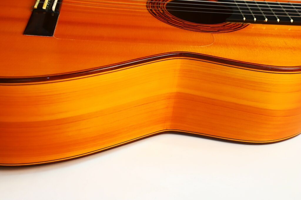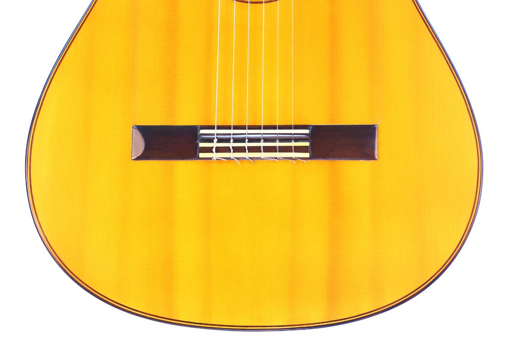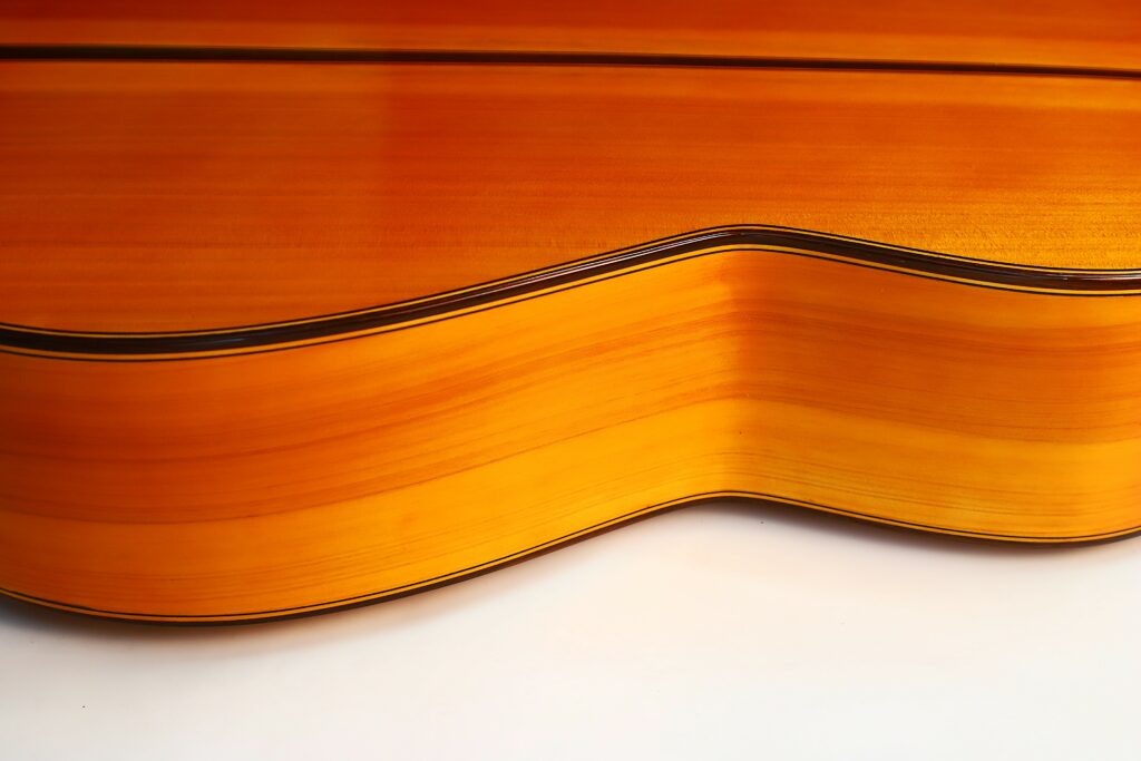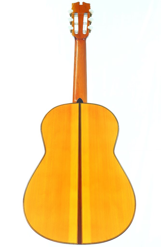 This Luis Sanchez 2002 flamenco guitar plays really well and produces an impressive flamenco sound – very Spanish with a mystical and warm nuance. It has an immediate attack with a honey-like, deep, woody texture. The guitar is very lightweight and spontabeous, typical of the best Andalucian flamenco guitars. We love this guitar as it has also this lyrical, singing quality to the sound. The bases are thick and well present. It can be very loud with a piercing volume and still it retains a charming tone.