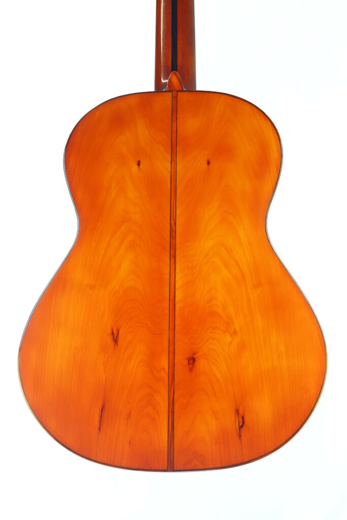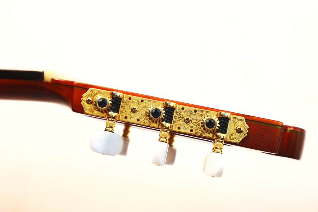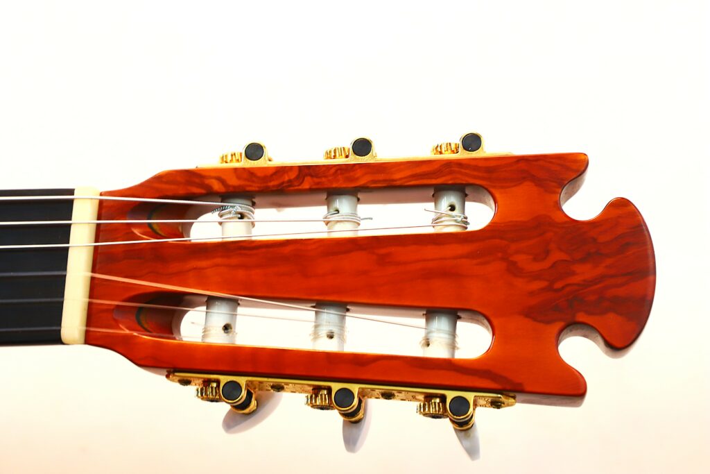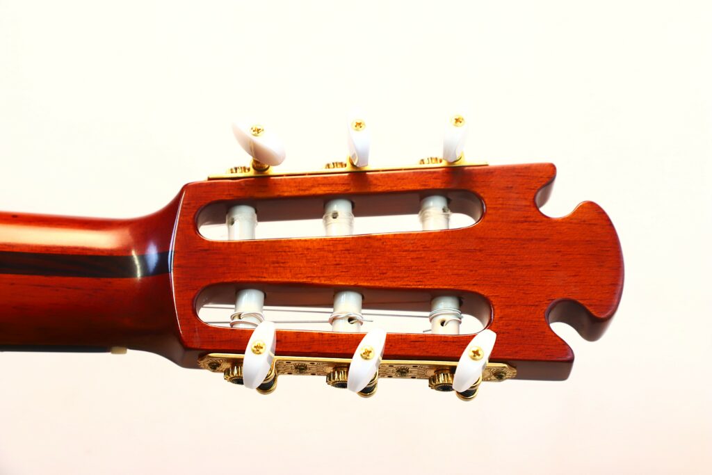 The guitar features a cedar top that enhances its clarity and responsiveness, beautifully complemented by cypress back and sides, which contribute a percussive quality and spontaneity to the overall sound.