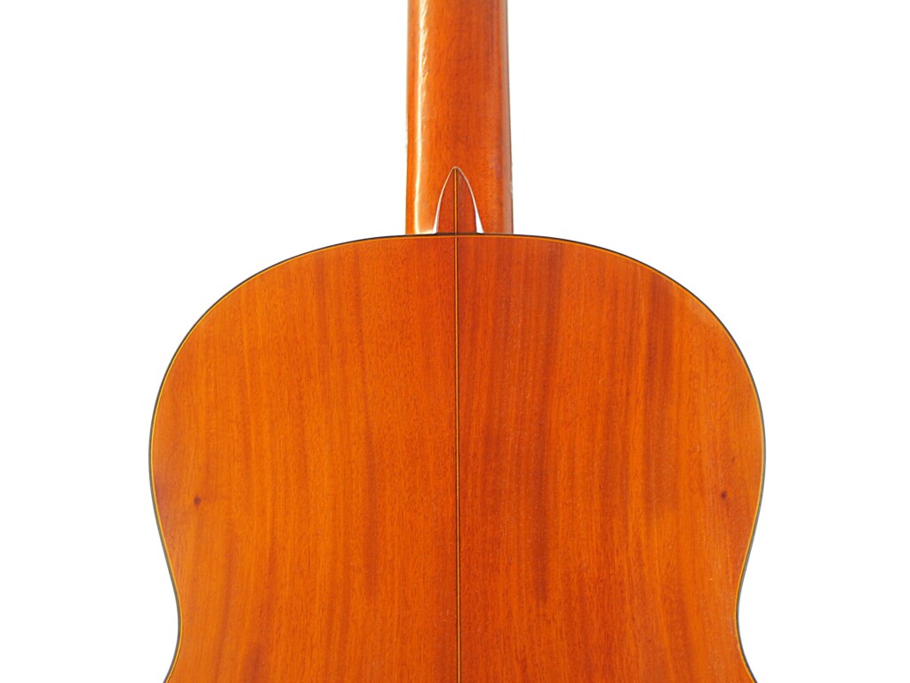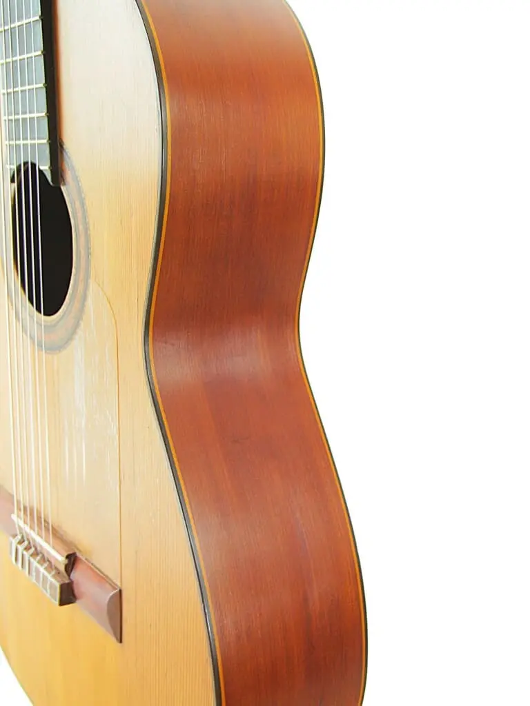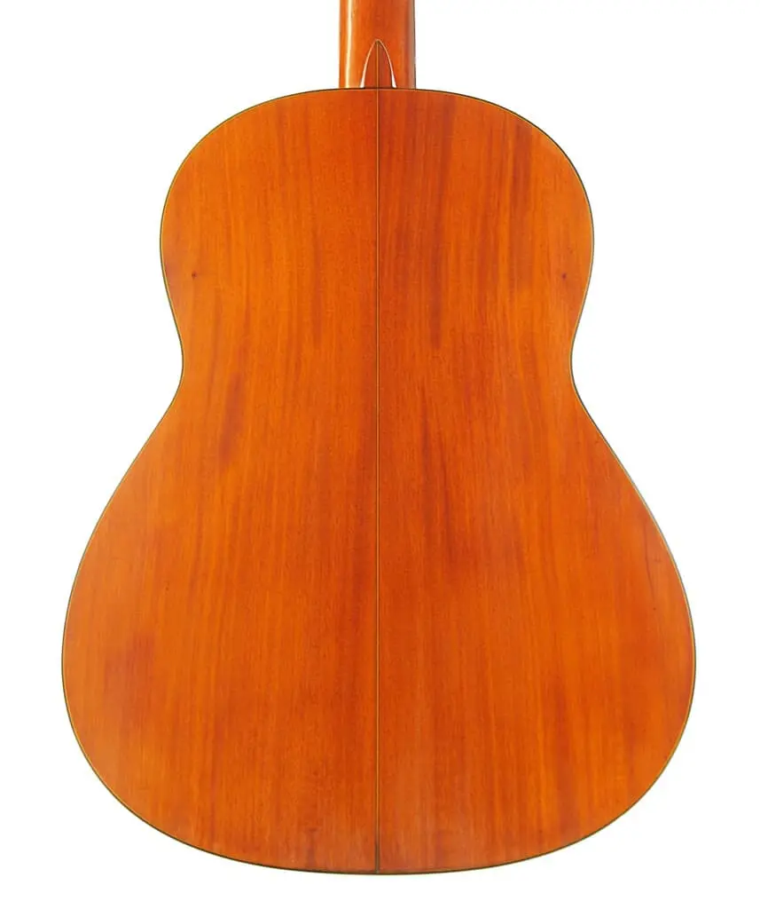 The guitar’s back, and sides are crafted from stunning mahogany. Manuel de la Chica had the opportunity to acquire old Cuban mahogany from a 16th century church interior. This enabled him to build many of his guitars with the highest quality mahogany. The aesthetic allure of this wood, its grain, and its hue contribute a distinct touch of artistry to the instrument.