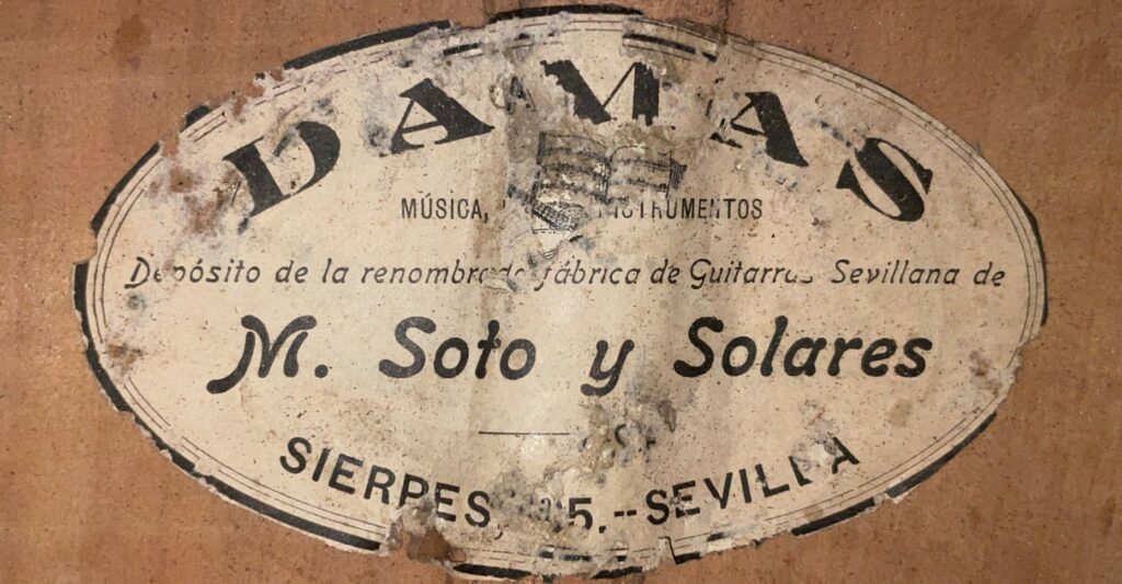 Manuel de Soto y Solares 1900 classical guitar – This exceedingly rare and collectible guitar by Manuel de Soto y Solares, crafted around 1900 in Sevilla, stands as a remarkable guitar. It is very similar to the guitars of Antonio de Torres … from the headstock to the measurements and construction details, the similarities are striking.
