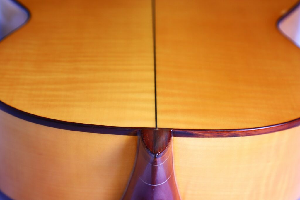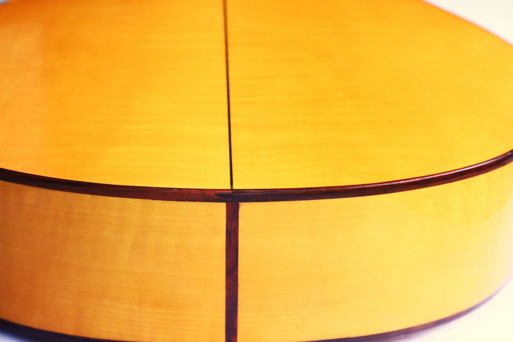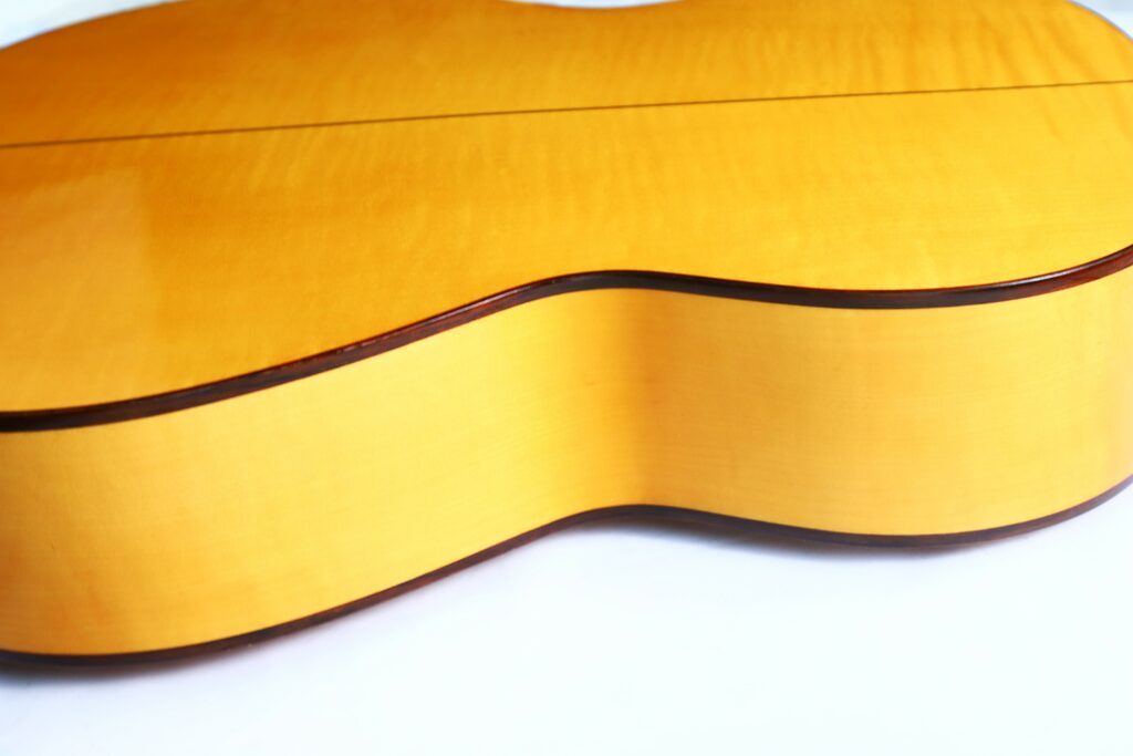 This great guitar has a spruce top and maple back and sides. It has a 660 mm scale length and 52 mm nuth width. The action at the 12th fret is comfortably low at 2.7 mm E and 2.2 mm e.